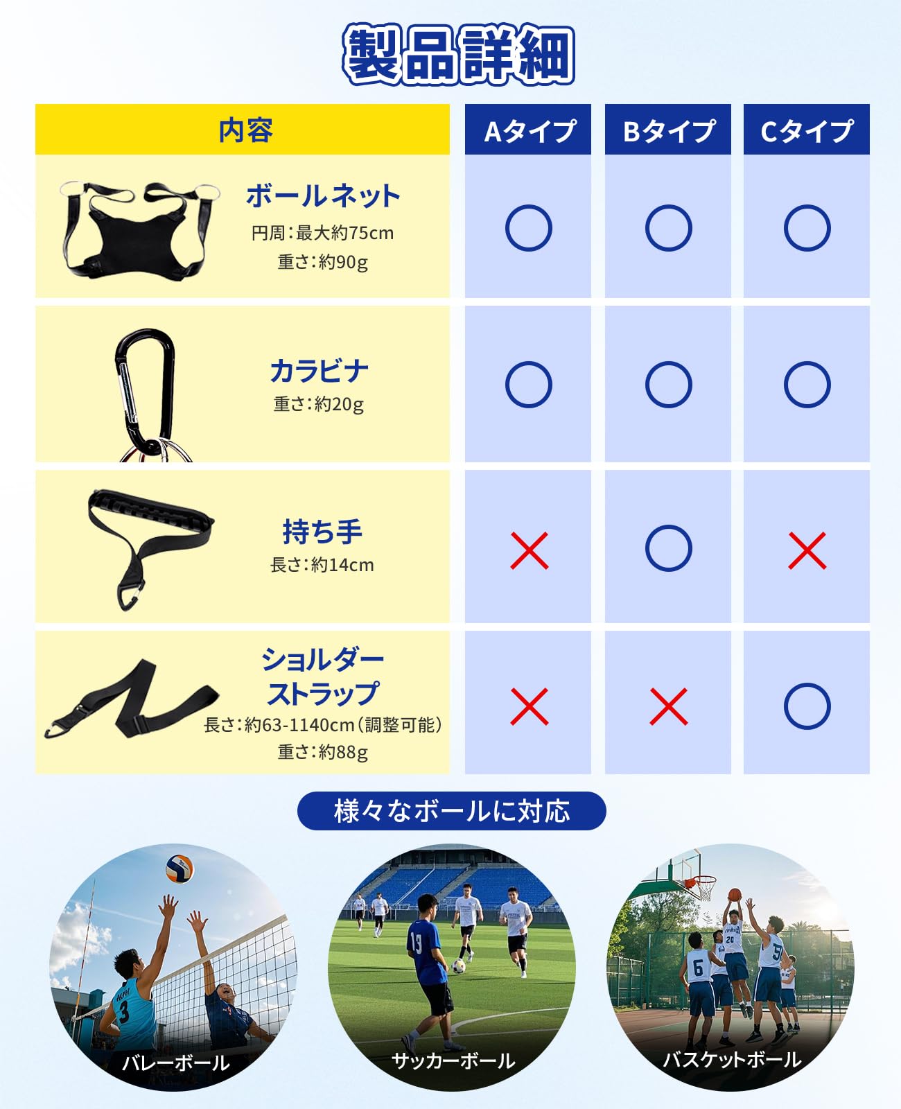 【3つのタイプ】3タイプのスタイルからお選びいただける。いずれも丈夫な素材でできており、縫製も丁寧なため、耐久性に優れ、頻繁に買い替える必要がなく、費用を節約できる。Aタイプはボールネット(カラビナ付き)、Bタイプはボールネット(カラビナ付き)+持ち手、Cタイプはボールネット(カラビナ付き)+ショルダーストラップだ。お好きなスタイルをご自由にお選びください。