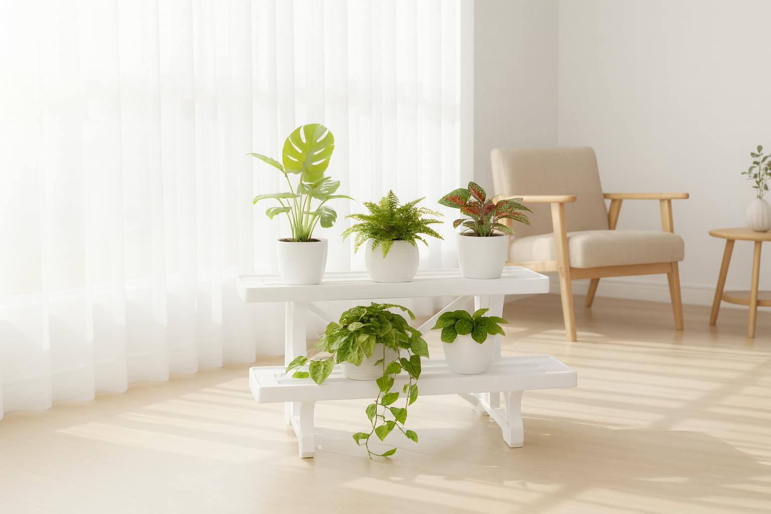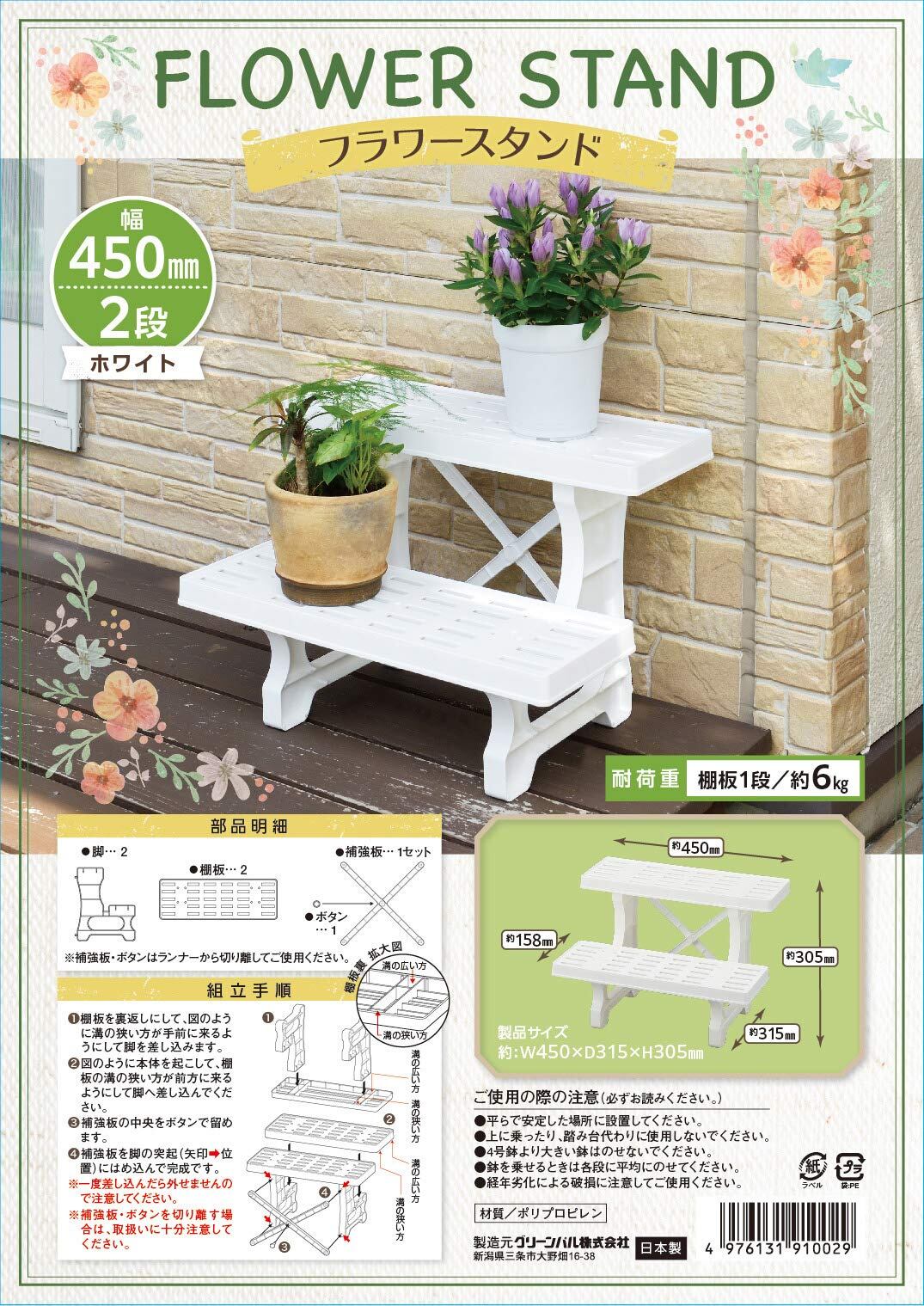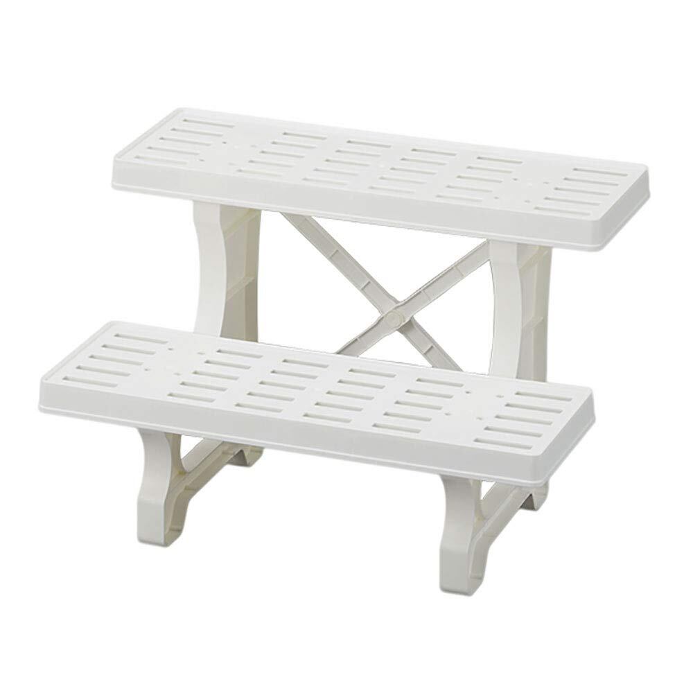 フラワースタンド2段 45cm幅 ホワイト プラスチック製 日本製 ・商品サイズ(約):幅45×奥行31.5×高さ30.5cm 重量:約770g 耐荷重:棚板1段あたり約6㎏ 組立品(組立時間15分目安) 材質:プラスチック製 高低差をつけてお庭やベランダを植物でオシャレに飾れます。工具不要で簡単組立。(組立時間目安:15分)