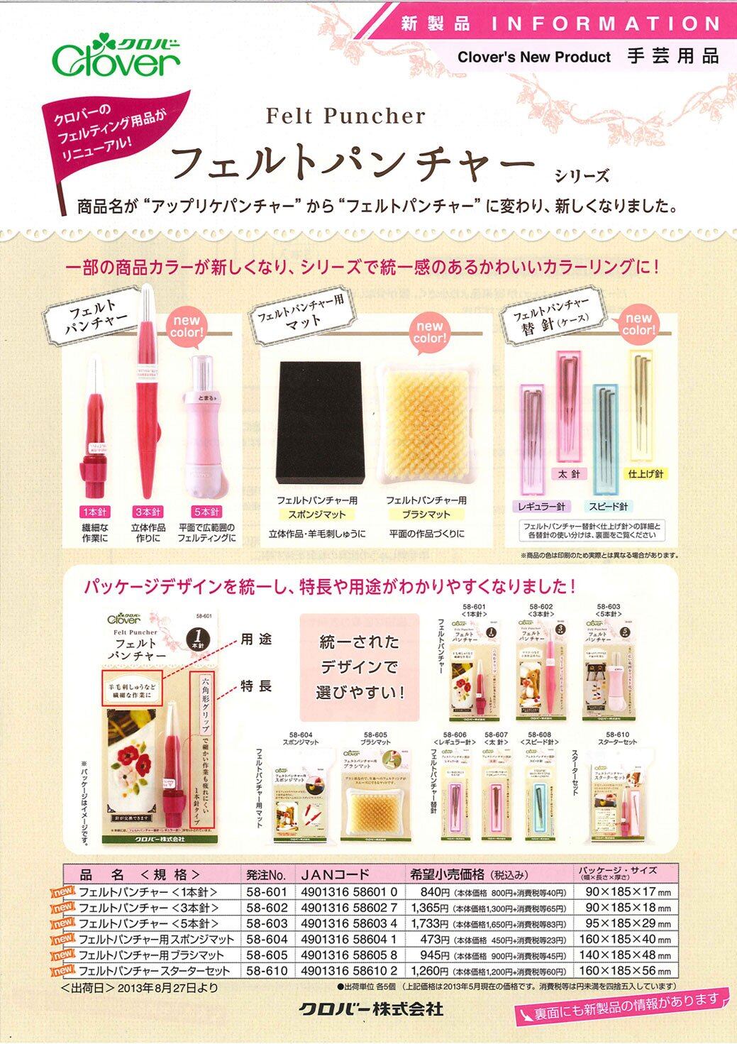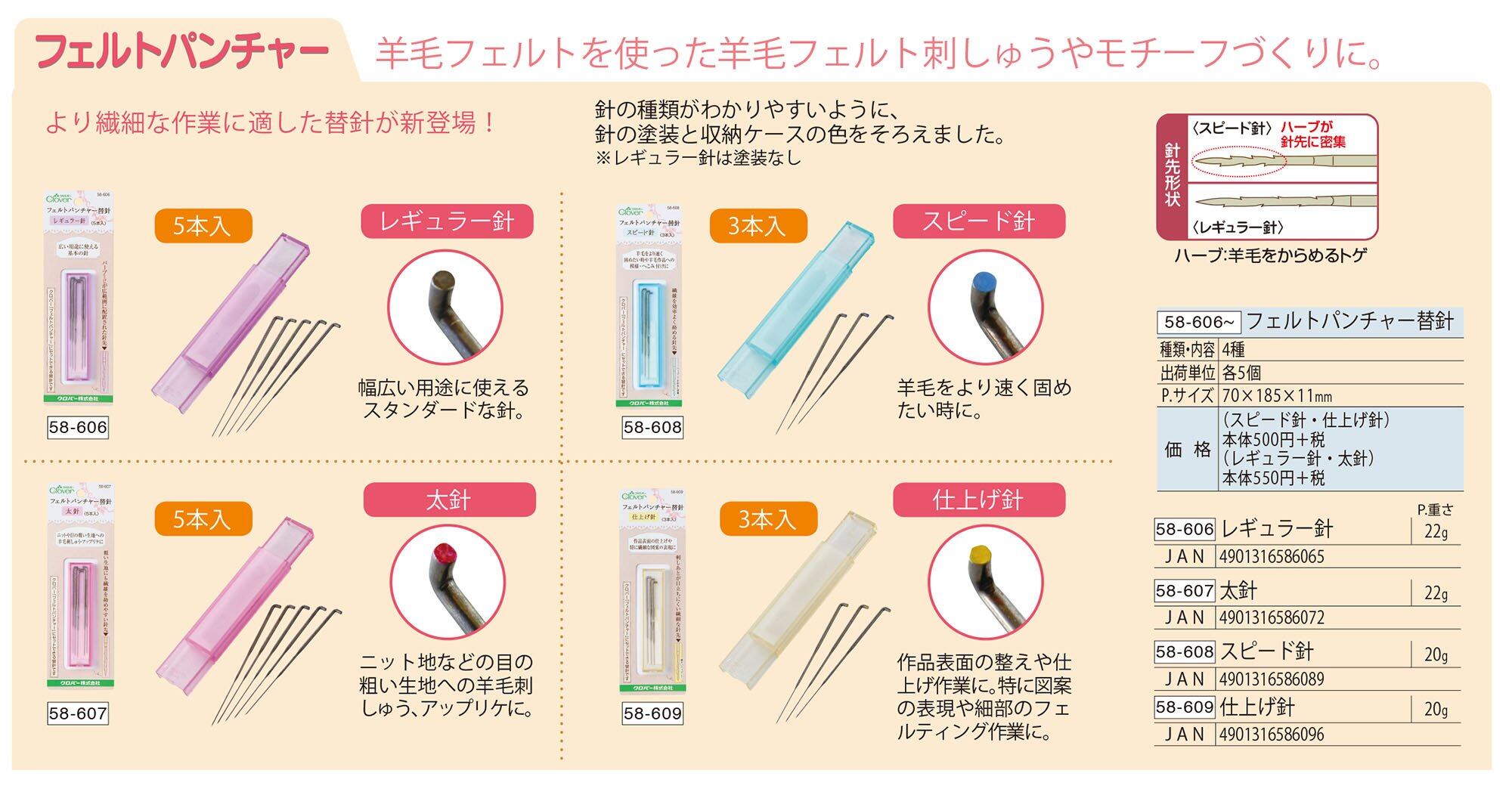 Clover フェルトパンチャー替針スピード針 58-608 対象性別 :男女共用 ~フェルトパンチャー替針~ 【スピード針】 羊毛より速く固めたい時、固めた羊毛に模様やへこみをつける時、羊毛刺しゅうの図案の輪郭を刺す時に。 バーブが針先に密集しているので、羊毛を短い刺しこみで効率よく固められる。 (より) 安全警告 羊毛手芸用の商品になります。商品の先端が尖っておりますのでお取り扱いにはご注意ください。