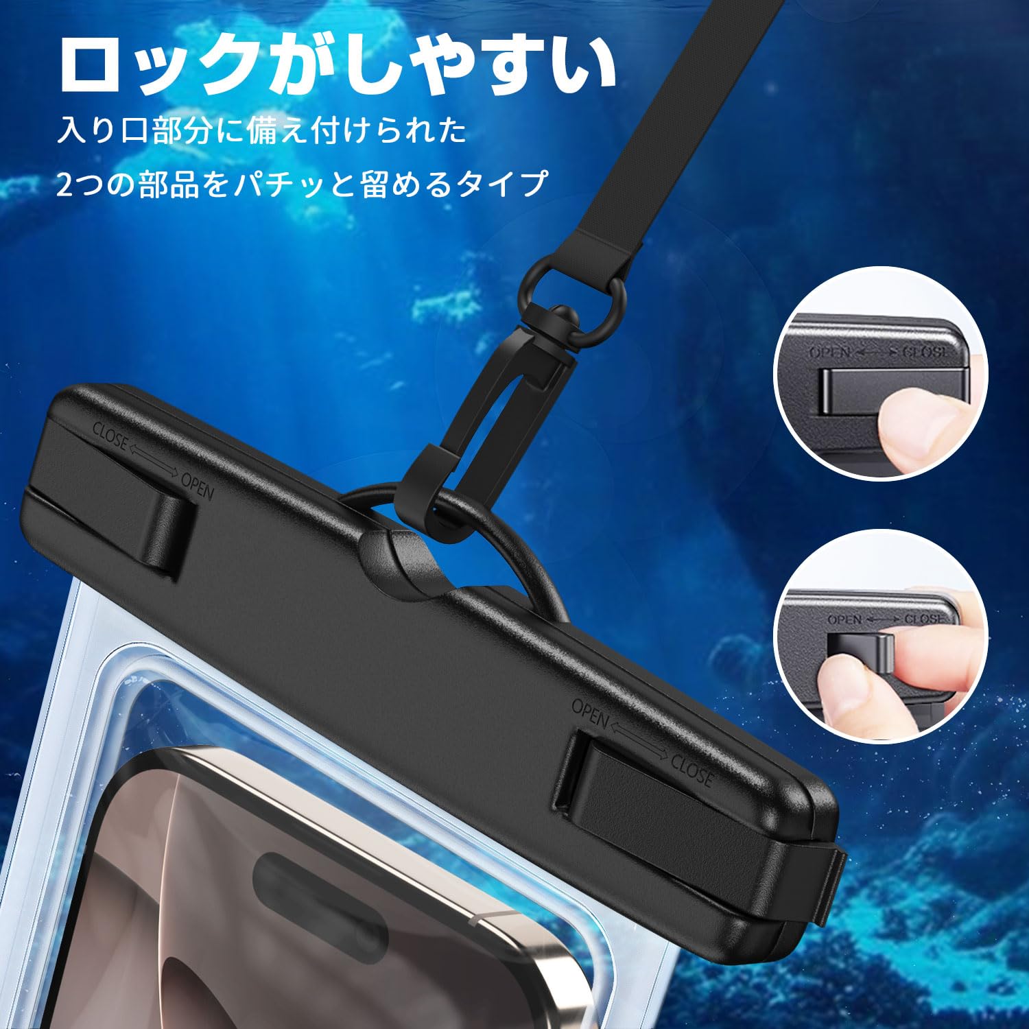 【ロックがしやすい】 防水カバーの入り口部分に備え付けられた2つの部品をパチッと留めるタイプ