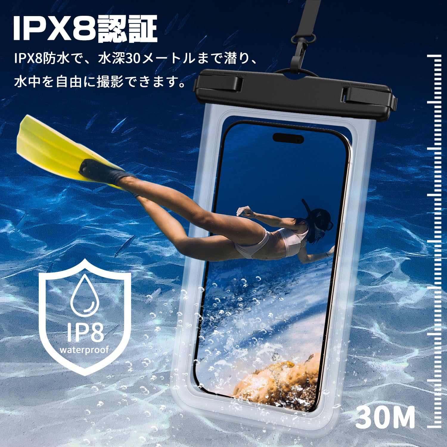 【IPX8認証】 スマホ 防水ケースはIPX8防水で、水深30メートルまで潜り、水中を自由に撮影できます。