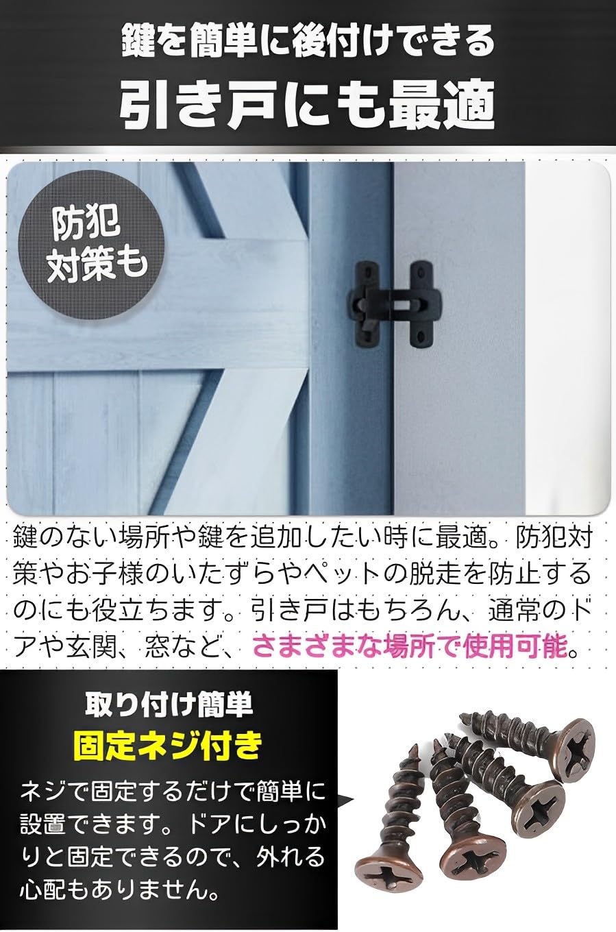 【引き戸にも最適】鍵のない場所や鍵を追加したい時に最適。防犯対策やお子様のいたずらやペットの脱走を防止するのにも役立ちます。引き戸はもちろん、通常のドアや玄関、窓など、さまざまな場所で使用可能。