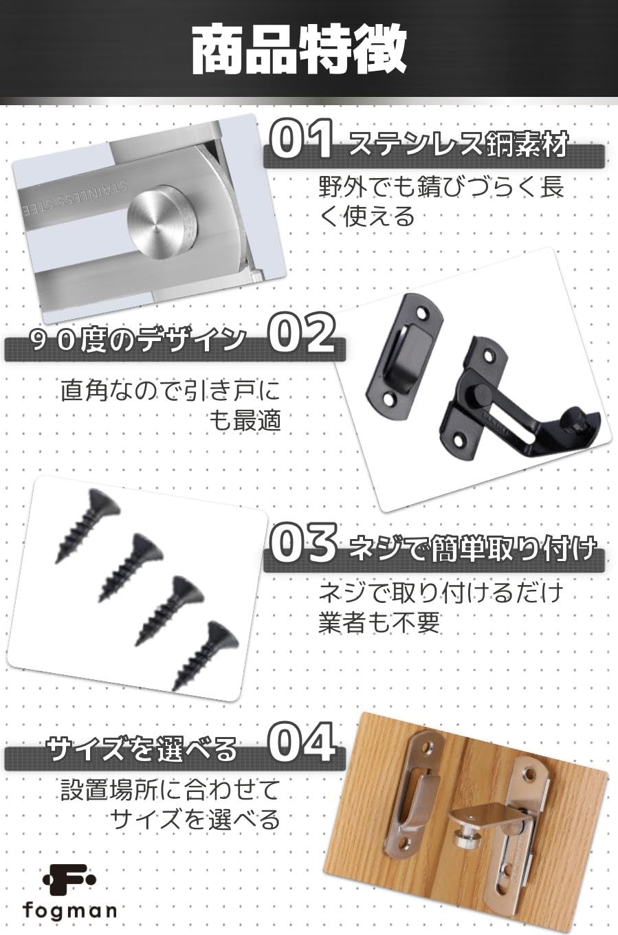 【商品特徴】①ステンレス鋼素材:野外でも錆びづらく長く使える/②90度のデザイン:直角なので引き戸にも最適/③ネジで簡単取り付け:ネジで取り付けるだけ、業者も不要/④サイズを選べる:設置場所に合わせてサイズを選べる【商品詳細】素材:ステンレス鋼 サイズS :5 x 4.2 x 3 cm M:7 x 6.2 x 4.1 cm/セット:2個