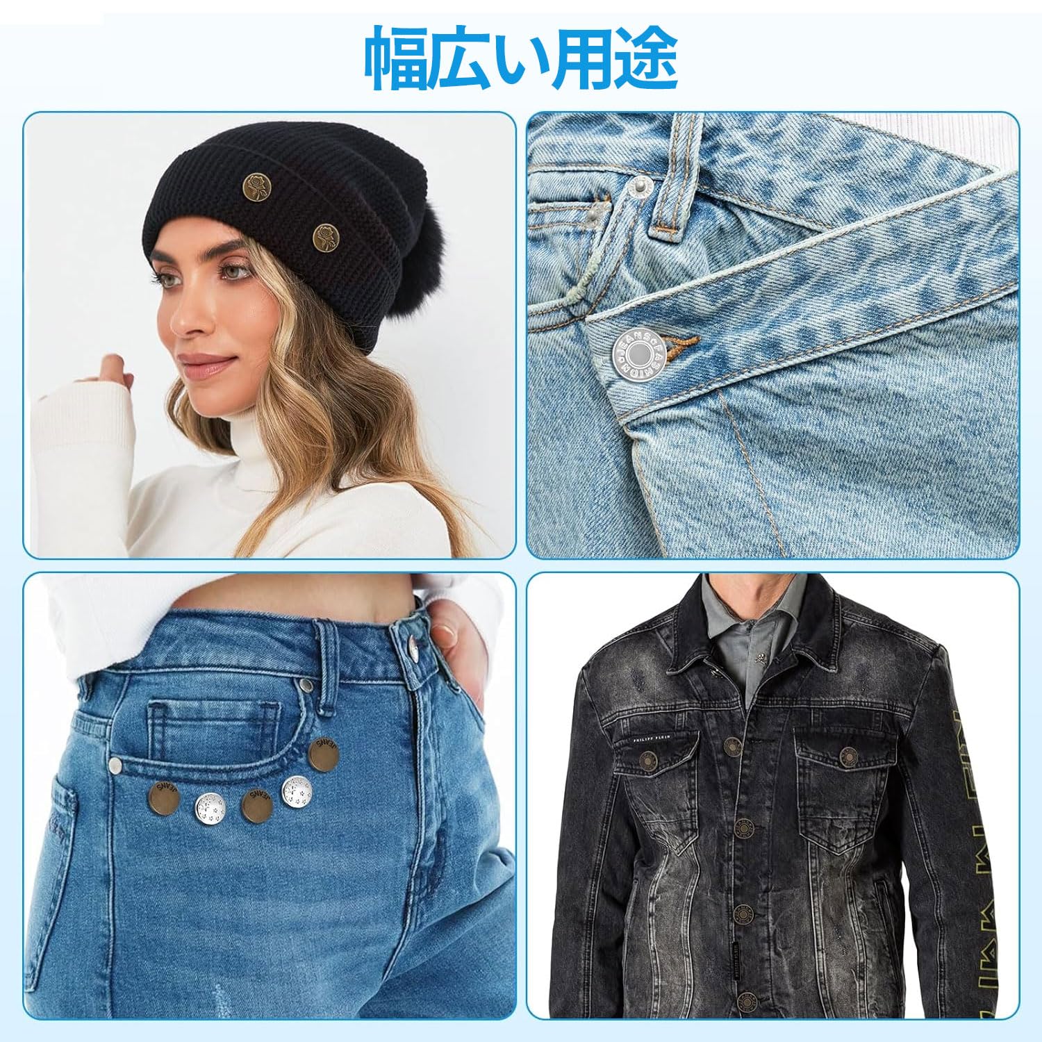 ??【工具不要、縫いなし、交換簡単】工具不要、縫製不要、取り付けがとても簡単なので、誰でも使用できます。厚手のデニム生地でも簡単に刺して取り付けられ、衣服に取り付けるのに縫製は必要なく、後ろカバーを引っ張ると自由に取り外しできます。繰り返し使用することができますので、ジーンズのボタンピンを外したいときに、工具不要で簡単に外せ、新しい洋服に再利用できます。