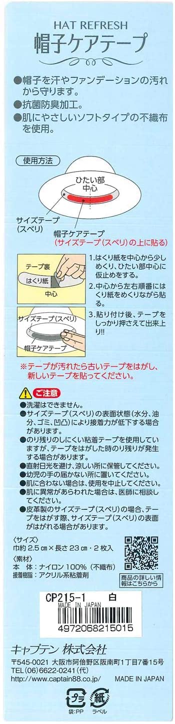 帽子 内側 の 額 が当たる部分に 貼り付け することで、大切な 帽子 を 汗 や ファンデーション の 汚れ から守ります。 抗菌 ・ 防臭 加工 。汗による不快な 臭い を防ぎます。 肌 に優しい ソフト タイプ の 不織布 を使用。