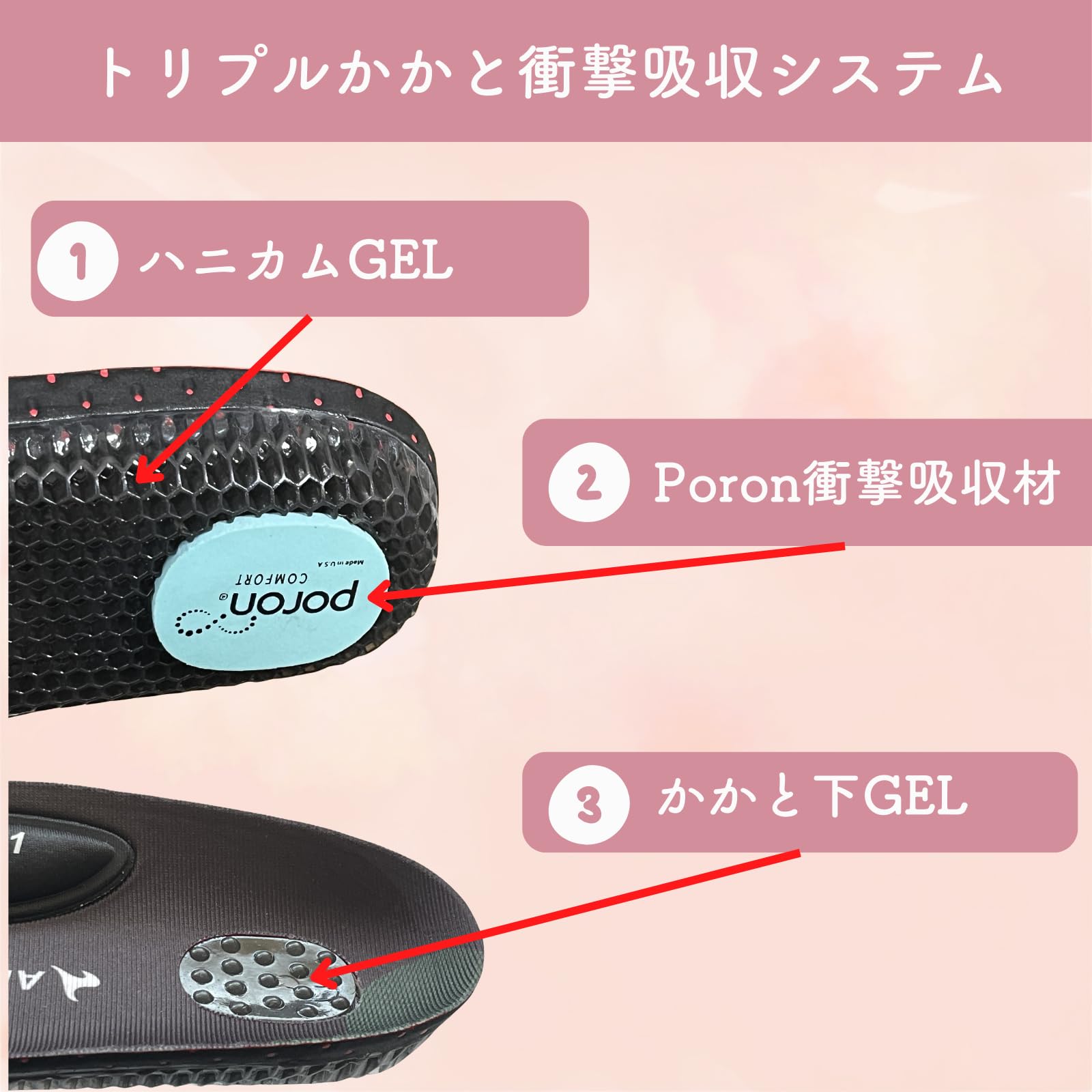 ? 【立ち仕事やスポーツの疲労対策】4層構造のインソールとかかと部分の衝撃吸収システム<ハニカムジェル+PORON+ヒールジェル>により長時間の立ち仕事やスポーツ時にかかとへの衝撃を和らげ疲労対策となります。
