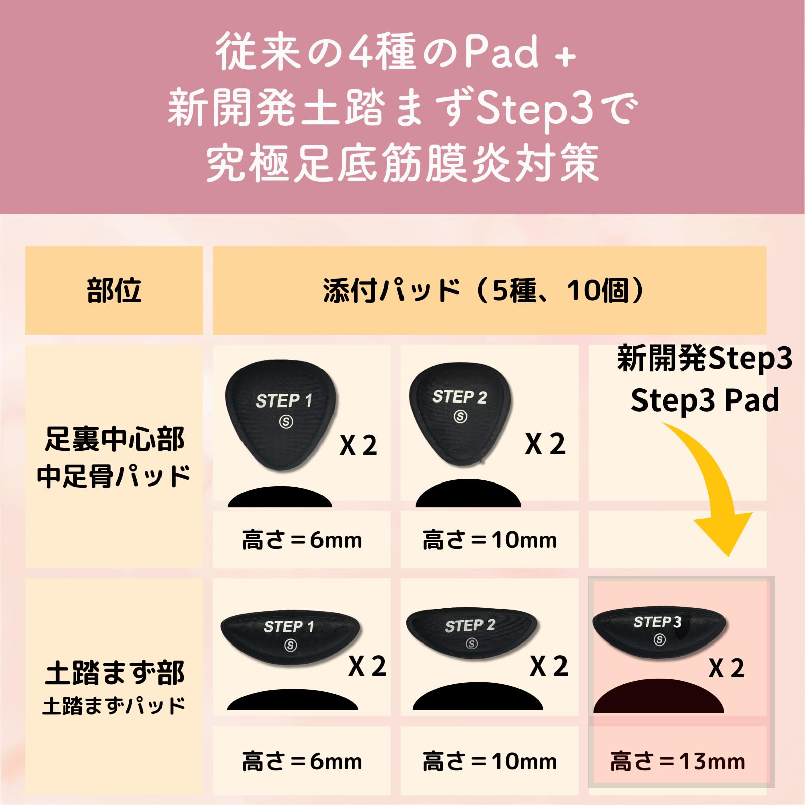 ? 【足底筋膜炎対策】その人にあった土踏まずサポート(アーチサポート)をすることで、足裏筋膜炎対策となります。ARESインソールでは個々の人に合う5種類、10個のパッドをご用意していますのでご使用のお客様の足の形にあった対策が可能となります。元々のインソール高さ(19mm)にStep1(6mm)、Step2(10mm)、Step3(13mm)のパッドを貼ることで25mm〜32mmの土踏まず高となります。
