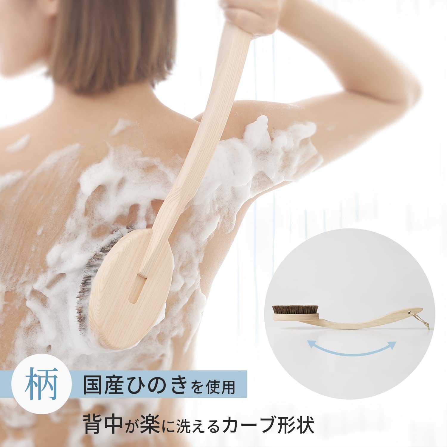 【曲柄で背中洗いにも楽々】柄は水に強いヒノキを使用。曲柄で、目が届かない背中も楽に洗えます。