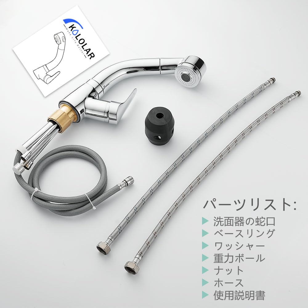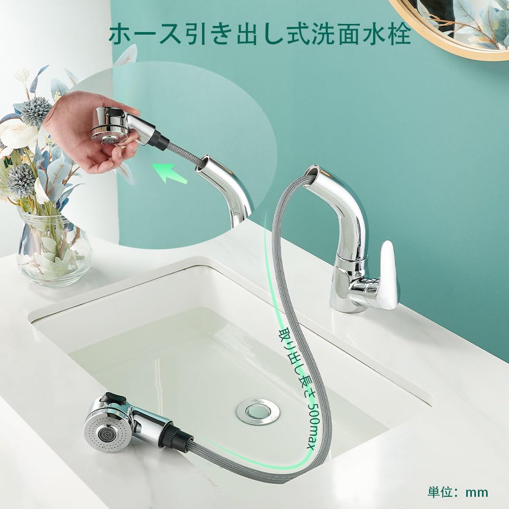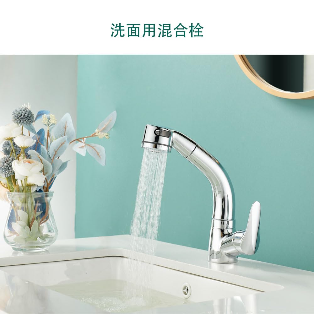 【ホース引き出し式】洗面水栓のホースは最長50 cm引き出し可能です,洗髪、洗面台をお掃除、場合はにはとても便利です。レバーひとつで水量と温度を調節でき、お年寄りからお子様までどなたでもご使用いただけます。