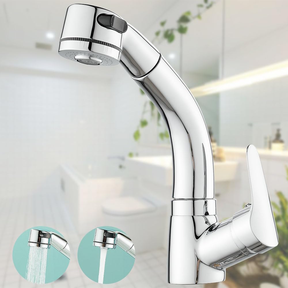 【特価処分】洗面水栓 洗面用混合栓 洗面台蛇口 台付き1穴 シングルレバー混合水栓 ホース引き出し式 360°回転 吐水口昇降 シャワ・泡沫切替 洗面用水栓金具 取り付けホース付き (クロム)