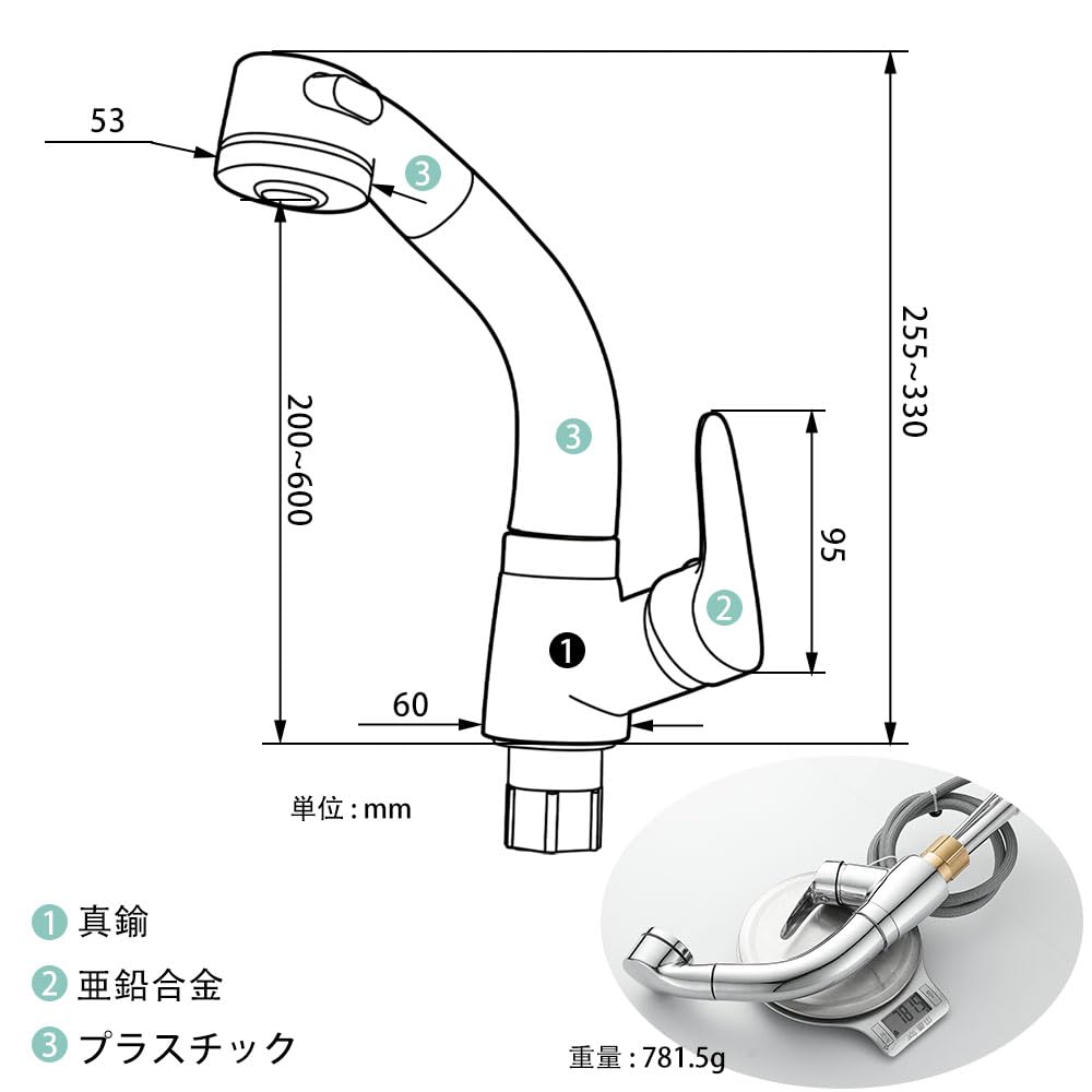 【素材と加工】水栓本体は真鍮製、リフト&プルチューブは環境に優しいABS樹脂製、ホースはPEX食品グレードのインナーチューブ製で、これらが一体となって単孔式リフト&プル水栓を形成しています。 豪華な外観、使いやすい、様々な洗浄のニーズを満たすことができます。
