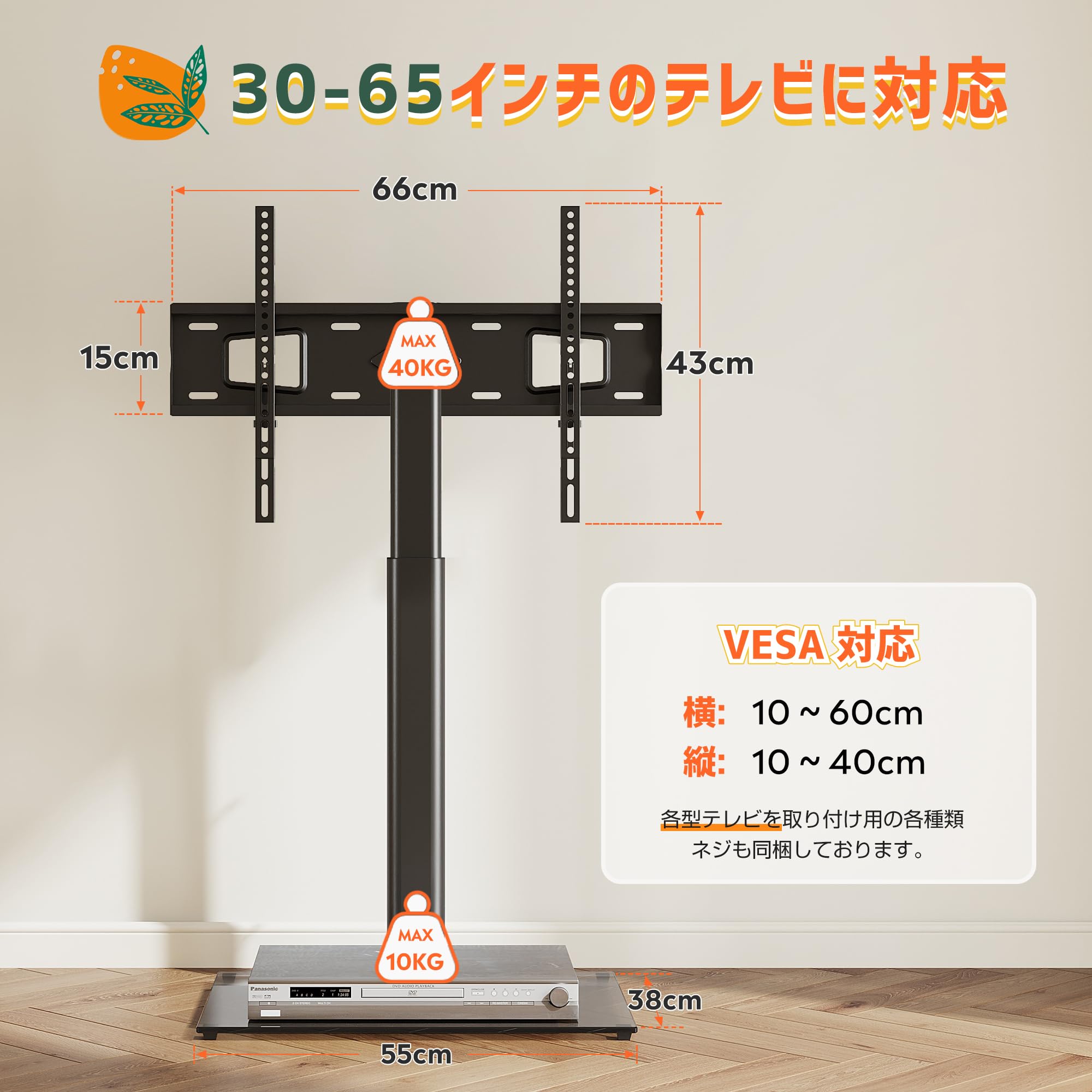 「商品仕様」商品サイズ:幅66×奥行き38×高106〜131.5cm 台座サイズ:幅55×奥行き38cm 重量:8.9kg 耐荷重:ラック/40kg 材質:本体/スチール 棚/厚み8mmの強化ガラステレビスタンド WLIVE 壁寄せテレビスタンドでは、1年期間がありますので、万一、欠品・不具合・配送破損などがあった場合は即座にご対応をさせて頂きたく存じます。お客様が安心してご注文して頂けるように最善を尽くして参ります。カスタマーサポートにお問い合わせの際、お手持ちのテレビの型番とご注文番号をお伝えいただければ、迅速に問題解決させて頂きます。24時間内で対応させていただきます。