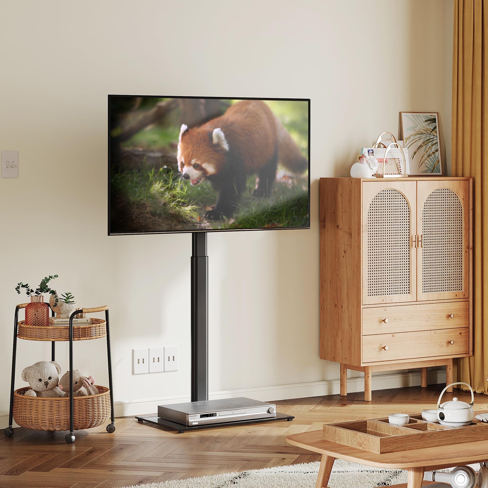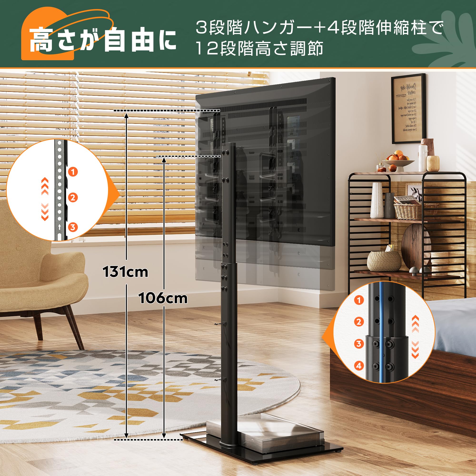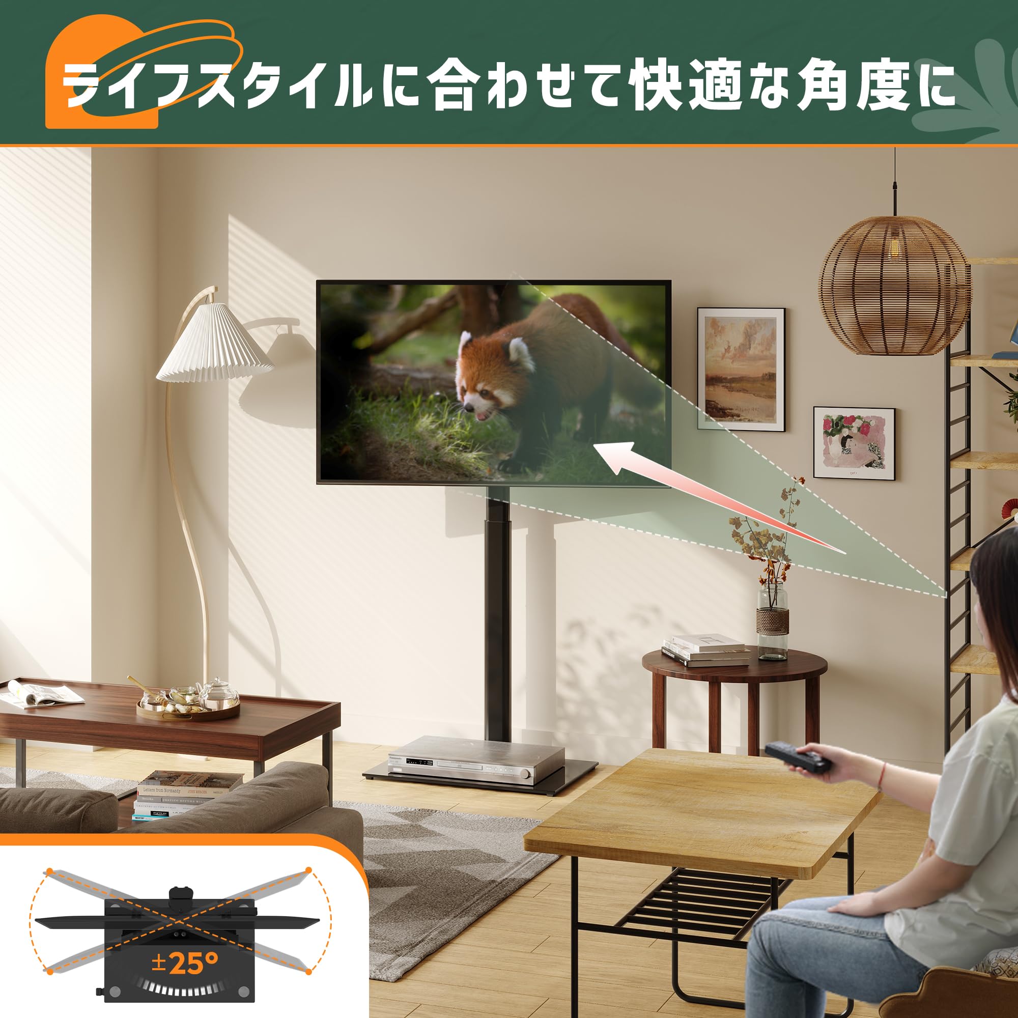 「便利的に高さ調節・左右回転可能」高さ3段調節伸縮することで、異なる身長のユーザーがテレビの高さに対する要求を完璧的に満たします。また、左右方向へ±25°回転することができるので、最適な調整角度で調整し、いろんな視角からの観賞を満たします。リビングルームだけでなく、キッチンや寝室に居ても、回転角度によって、素晴らしい瞬間を見逃しません。床座りと座椅子の低い位置に、お昼ご飯時に、家族と一緒に楽しみ時間を過ごします。