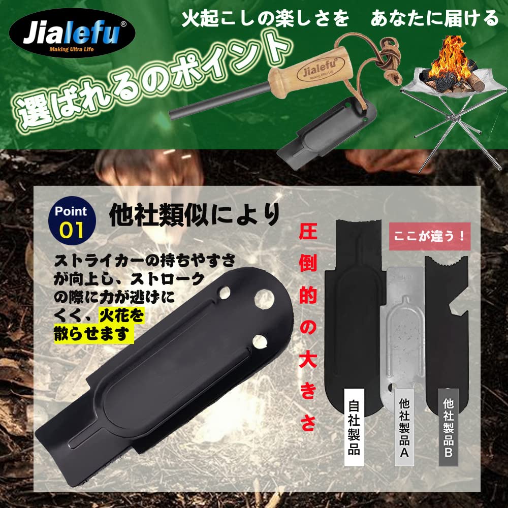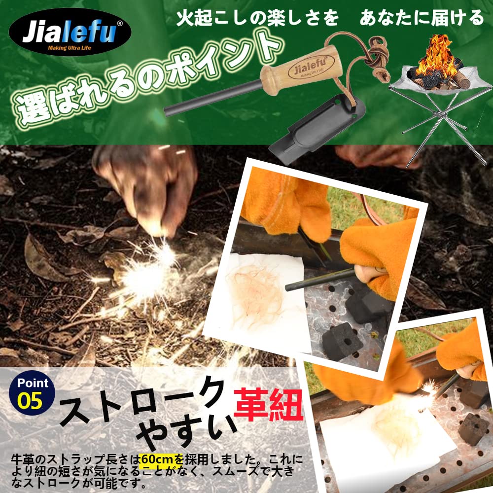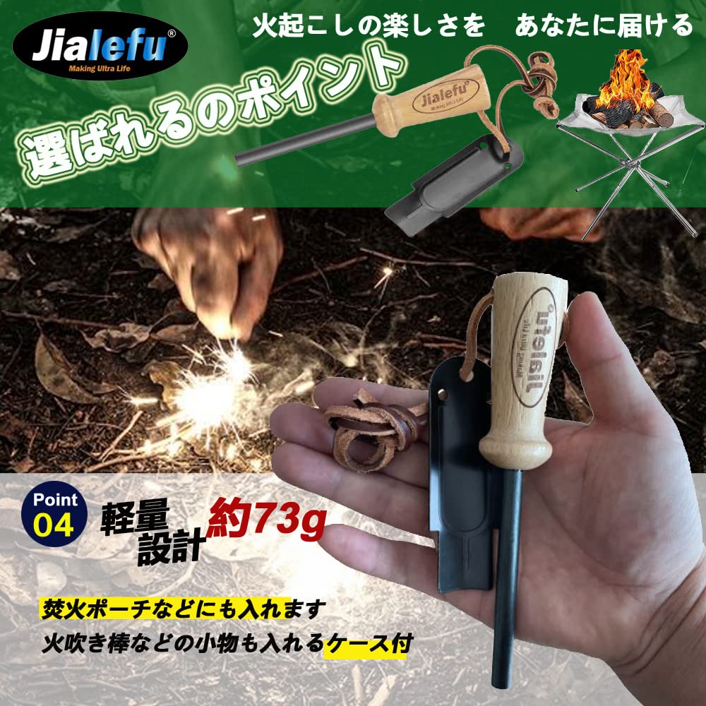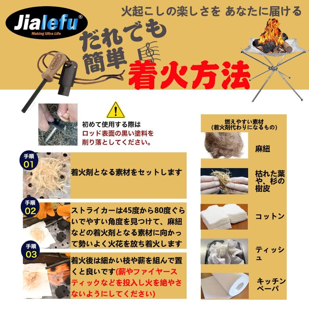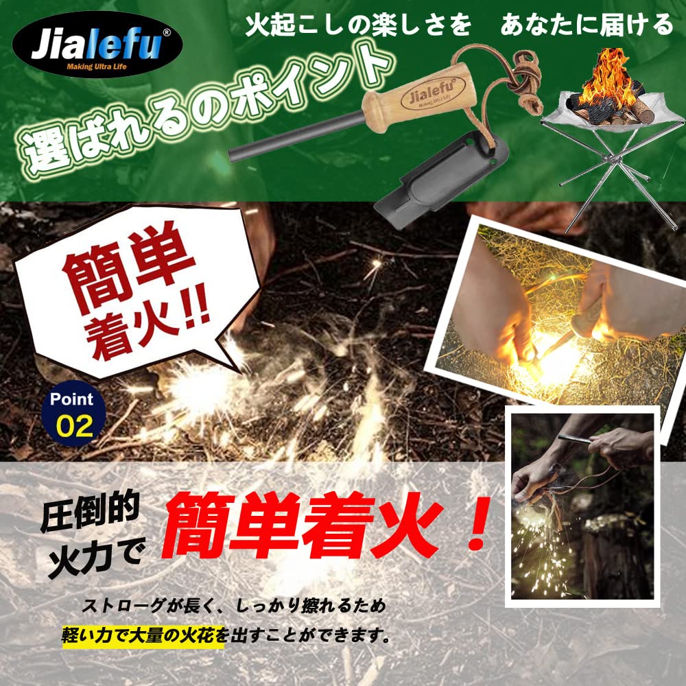 【圧倒的火力】持ち手とロッド部分が大きく、火花を散らすことを徹底的に考え抜いたストライカー、これらによって異次元の着火力を実現しました。しっかり擦ることができるので大量の火花を出すことができます。これまでファイヤースターターで火起こしがうまくできなかった方、初めて火おこしに挑戦する方にもおすすめです。ブッシュクラフトでは必須のアイテムです!