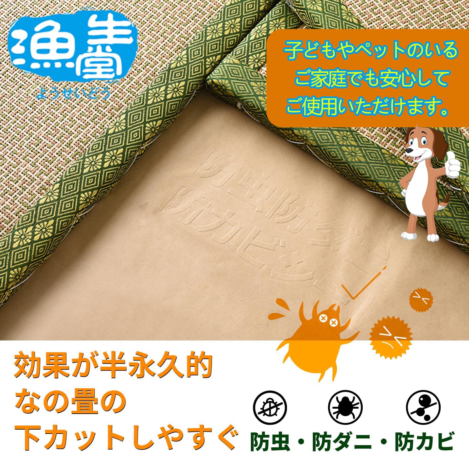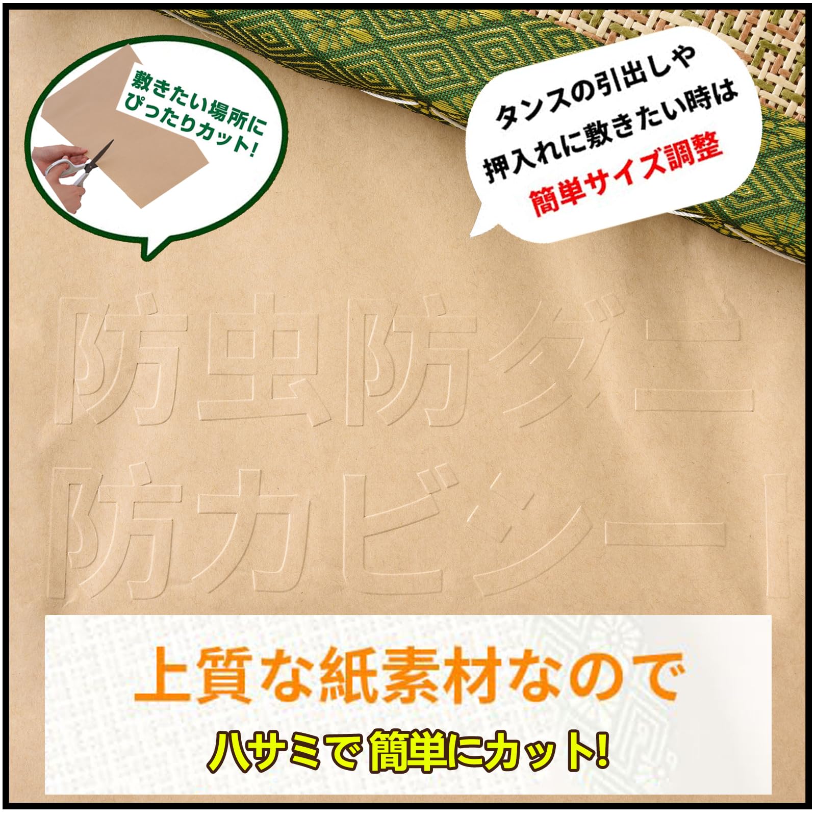 【適用場所】畳の下や押入れ・タンスの引き出し等にお使い下さい。※防虫紙は粘度がなく、畳の下に置くと逃げてしまう可能性があるので、くっつけたほうがいいです。サイズが長すぎると必要なものにカットされる可能性があります。