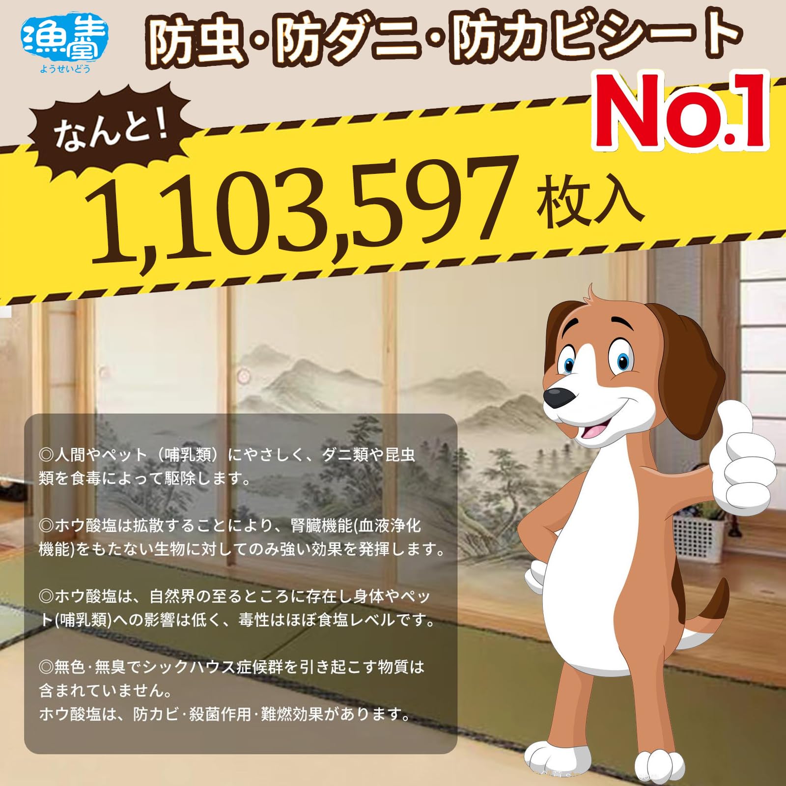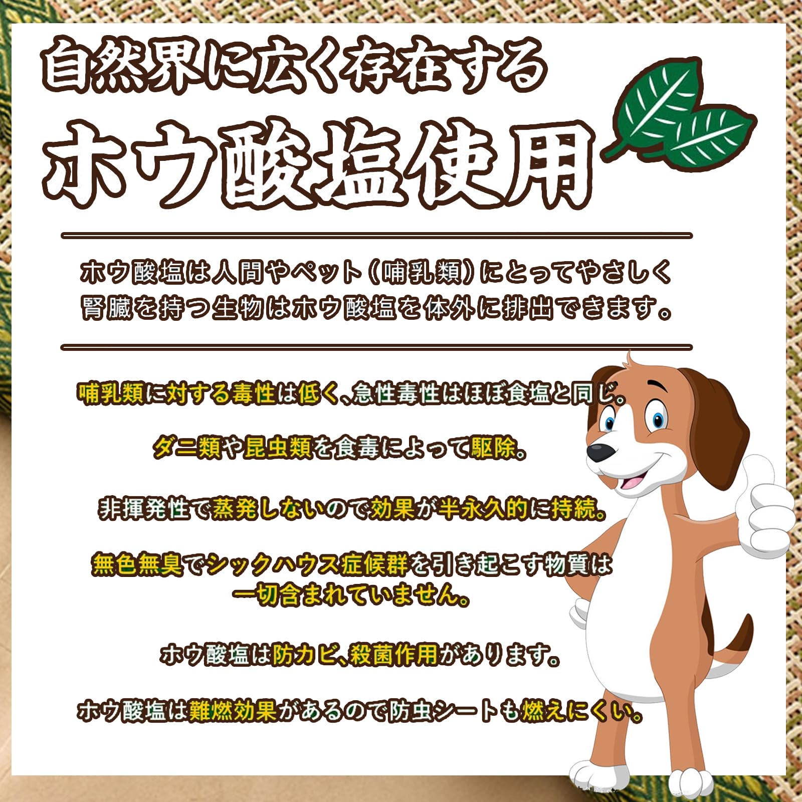【半永久的に持続 】ホウ酸塩は揮発性の物質ではないため、効果は半永久的に持続します。ホウ酸塩は、防カビ・殺菌作用・難燃効果があります。水溶性が高い物質のため、長時間にわたり水分などに浸かった状態が続くと、ホウ酸塩がシートから溶け出して、効果が減少します。