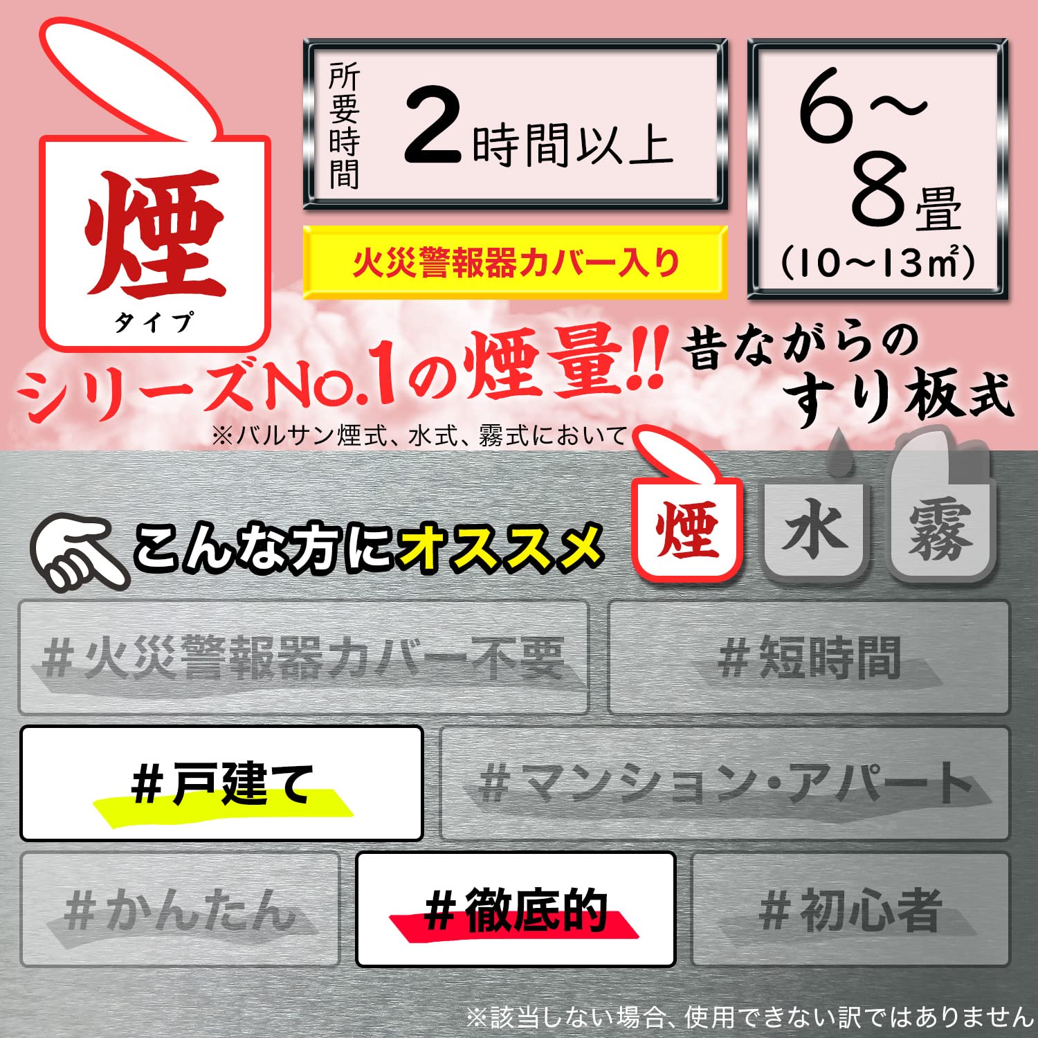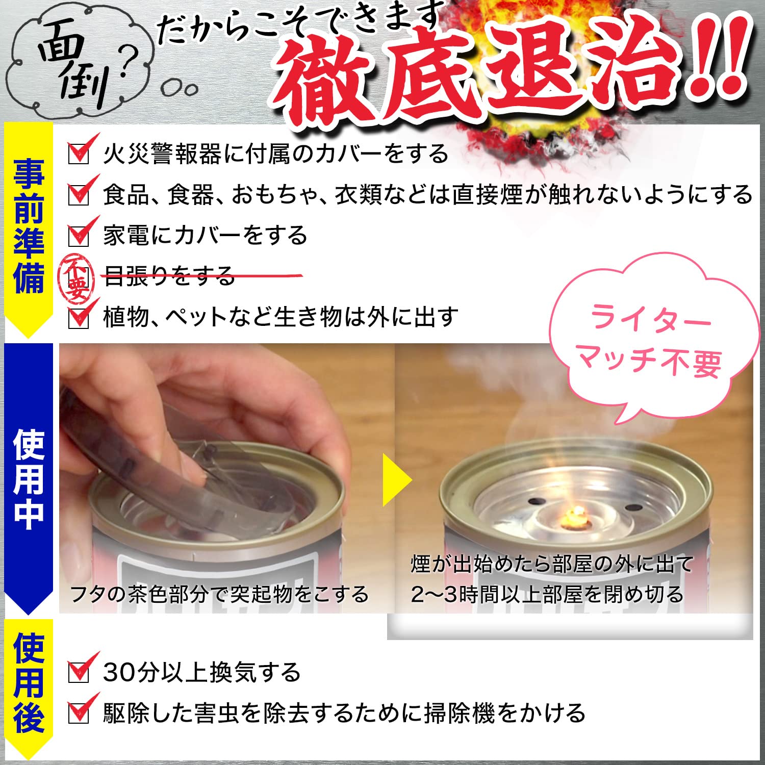 煙タイプのくん煙剤は、6?8畳の部屋で使用します。使用前に部屋をよく換気し、使用中および使用後は部屋を退出してください。