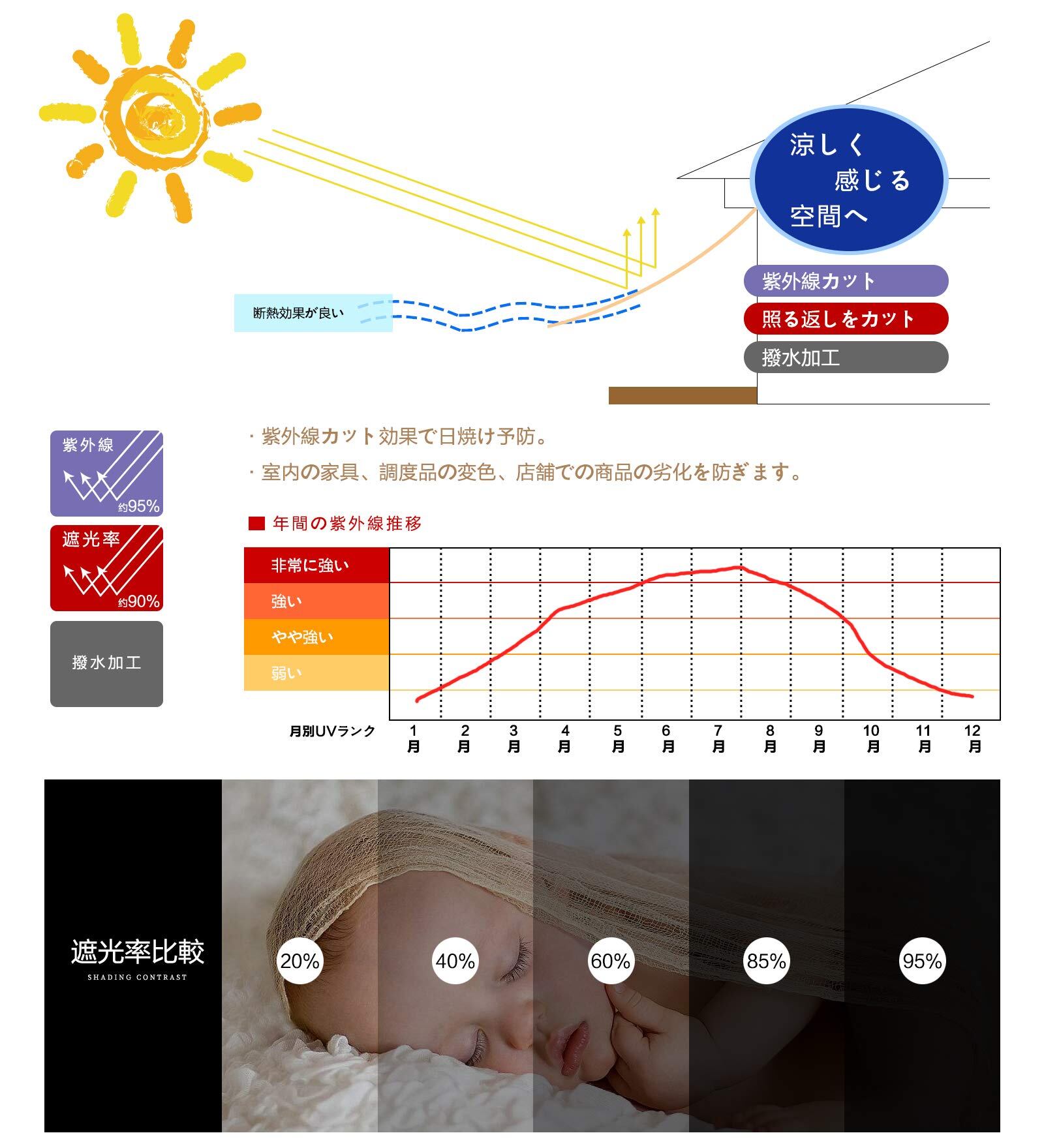 撥水性がある素材で、熱気がこもらず、遮光率90%で日差しと紫外線をカットすることで省エネ効果も期待できます。窓の外に組み立てたら、部屋の温度は即下げることができます。外から見えにくくなり、日差しと視線を遮って、涼しく快適にお過ごしいただけます。