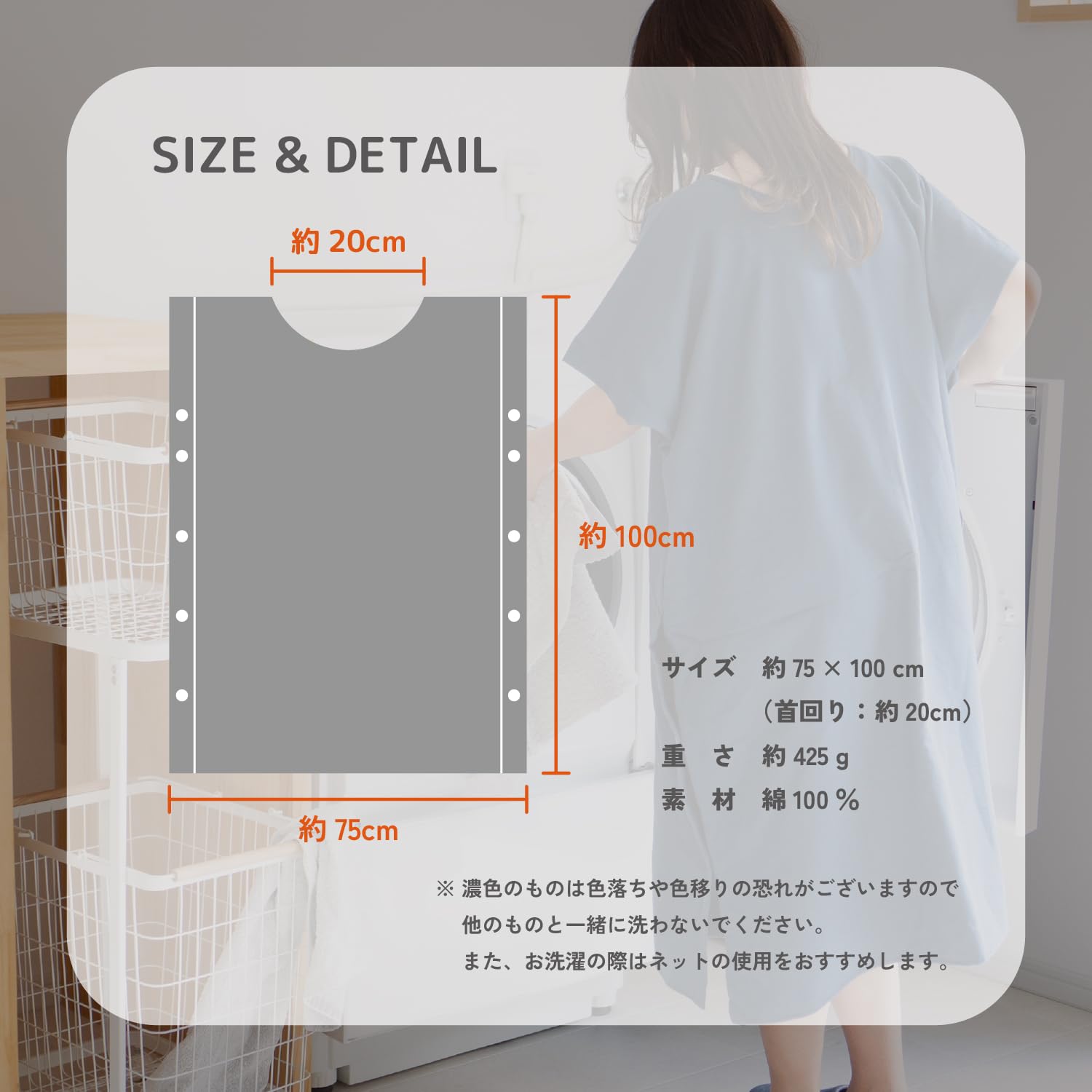 【簡単お洗濯】 タオル生地で出来ているのでご自宅の洗濯機で毎日ジャブジャブ洗えます。 バスタオルを干すように物干し竿に干せるのでお洗濯も簡単。 スナップボタンを留めると落下防止にもなって安心です。