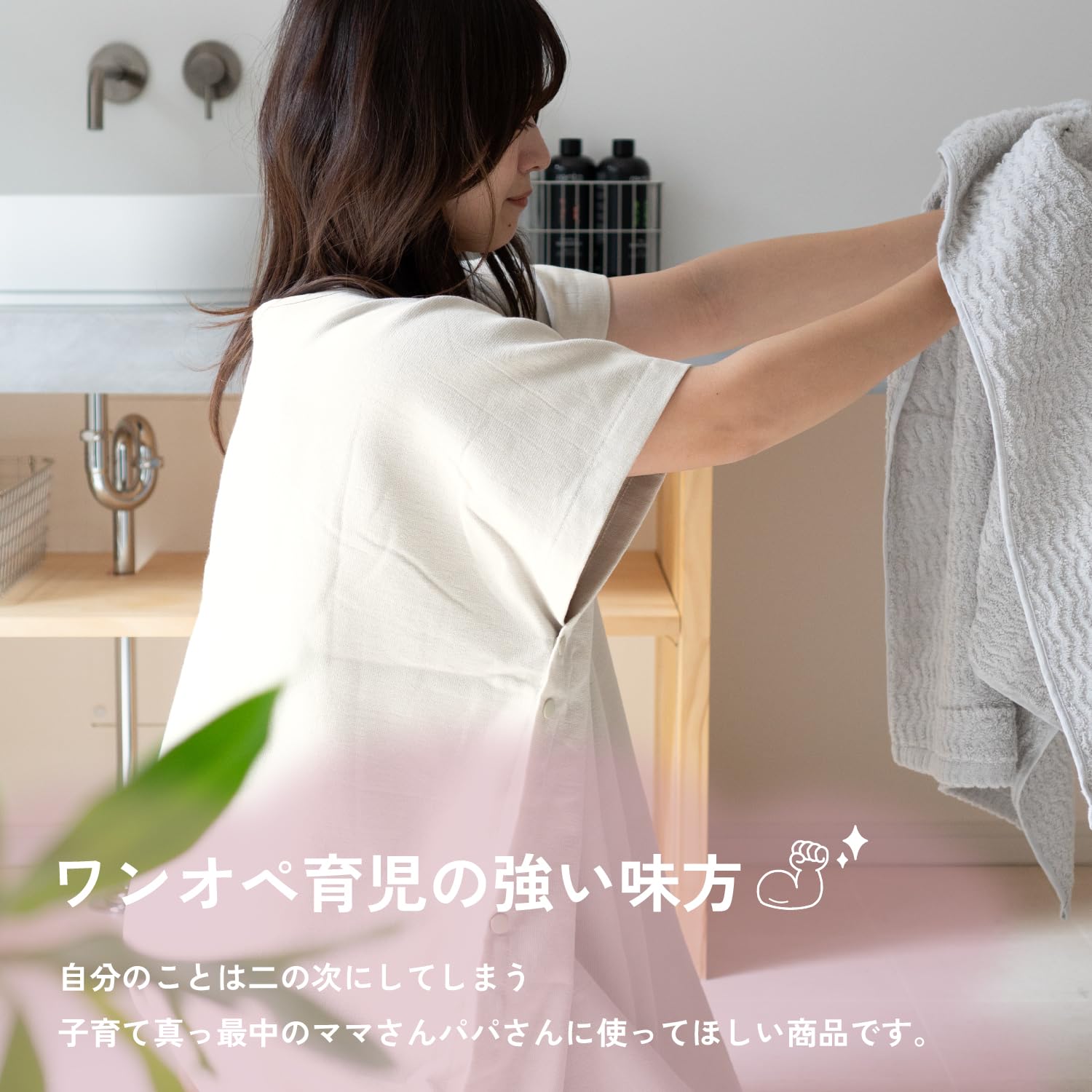 【忙しいママのお風呂上りに】 子どもとお風呂に入ると、体や髪を拭いてあげるのに忙しいですよね。まずは子どもの着替えを優先するママさんも多いと思います。 そんな時にものの数秒で被るバスタオルはお風呂あがりの強い味方に。秋冬の寒い季節は湯冷め防止の効果も。