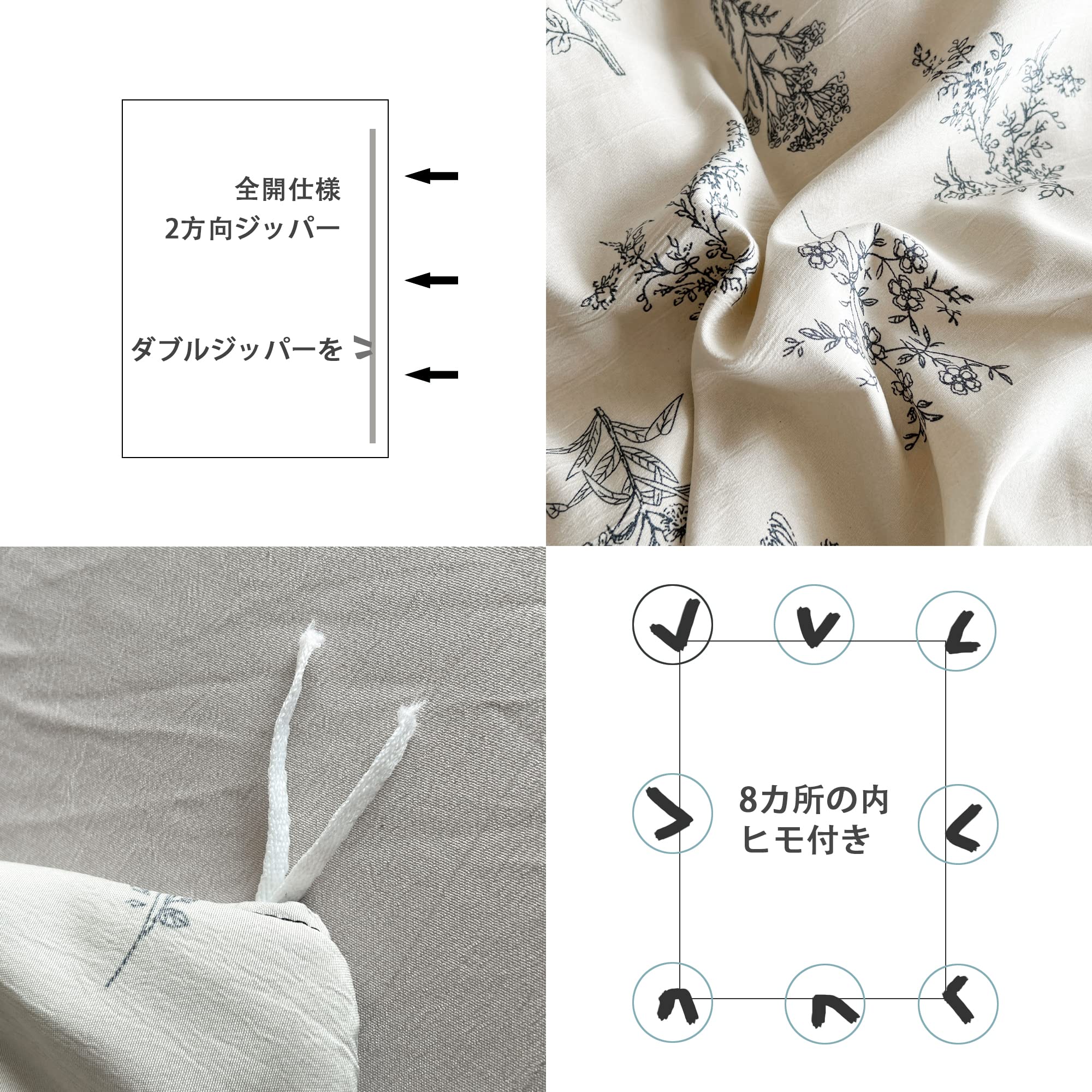 ??心を込めた設計:枕カバー:合わせ式。掛ふとんカバー:片側全開仕様と良いダブルジッパーを採用、スムーズな開閉と出し入れを実現、8カ所の内ヒモ付きでズレにくい、ボックスシーツ:全周ゴム付き、和洋兼用。