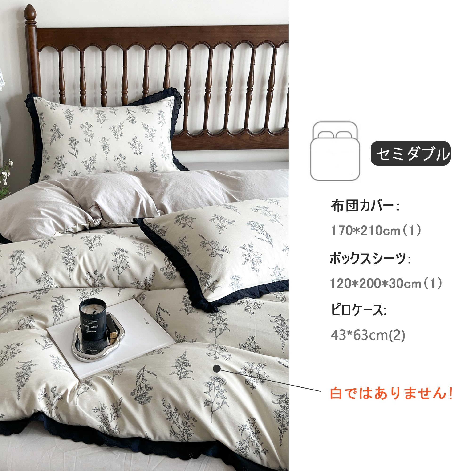 【新着特価】【布団カバーセット セミダブル 4点セット】フリル付き ダブルジッパー掛け布団カバー オールシーズン対応 洋式・和式兼用 ボックスシーツ 枕カバー 寝具カバー 軽量通気性 花柄 おしゃれ ブラック花(掛カバー170*210cm)