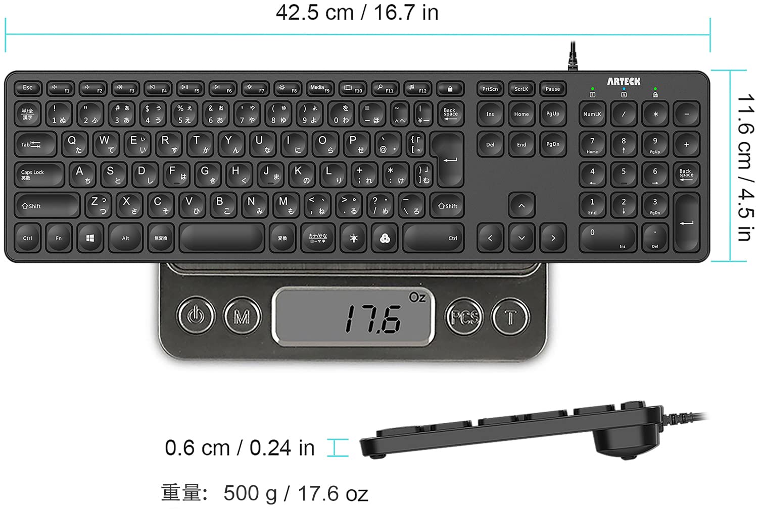 超軽量、薄型デザイン:コンパクトサイズ「16.7X 4.5 X 0.24インチ」と軽い重量「17.4オンス」、フルサイズで矢印キー、ショートカットキー、テンキーが付き、快適なタイピングが可能です。