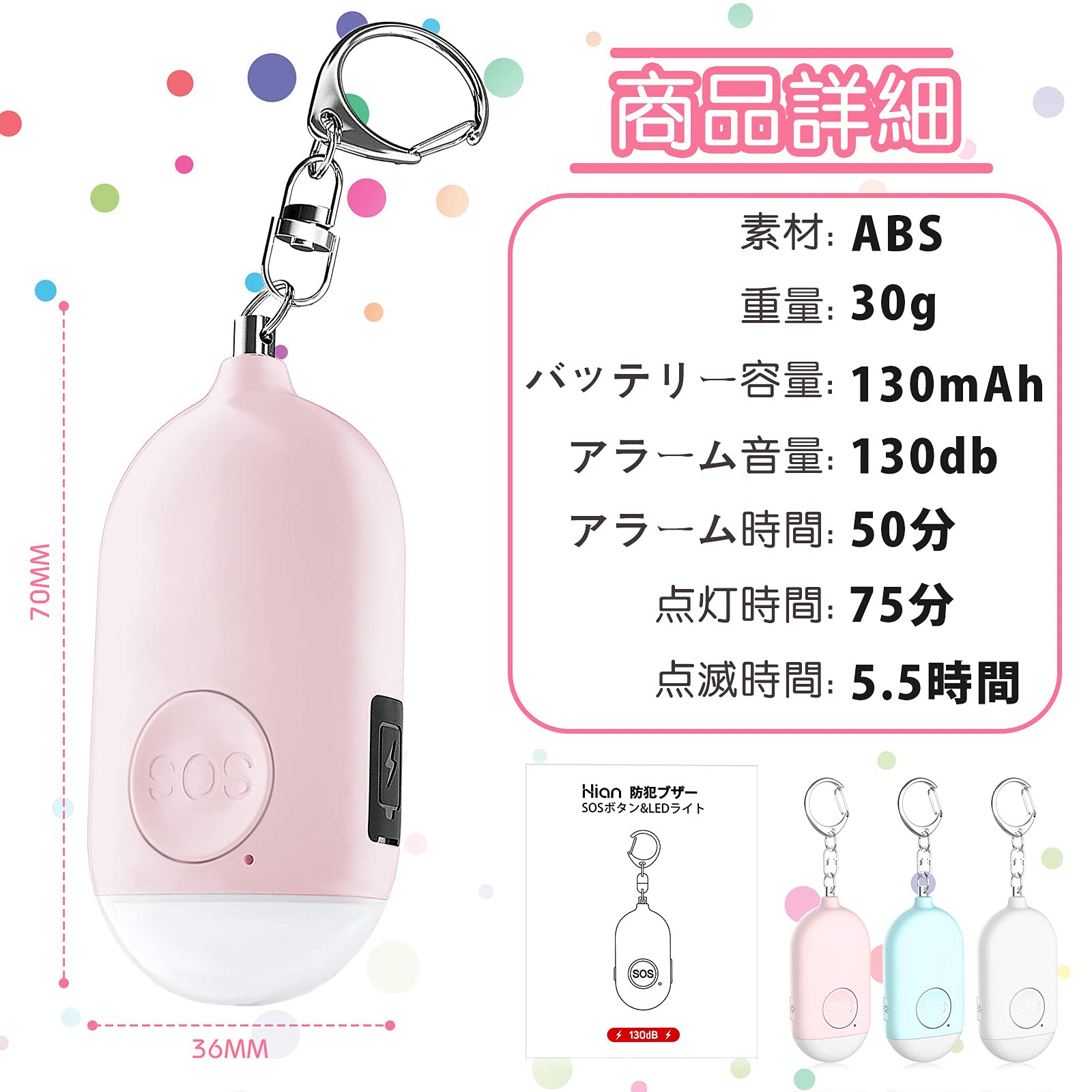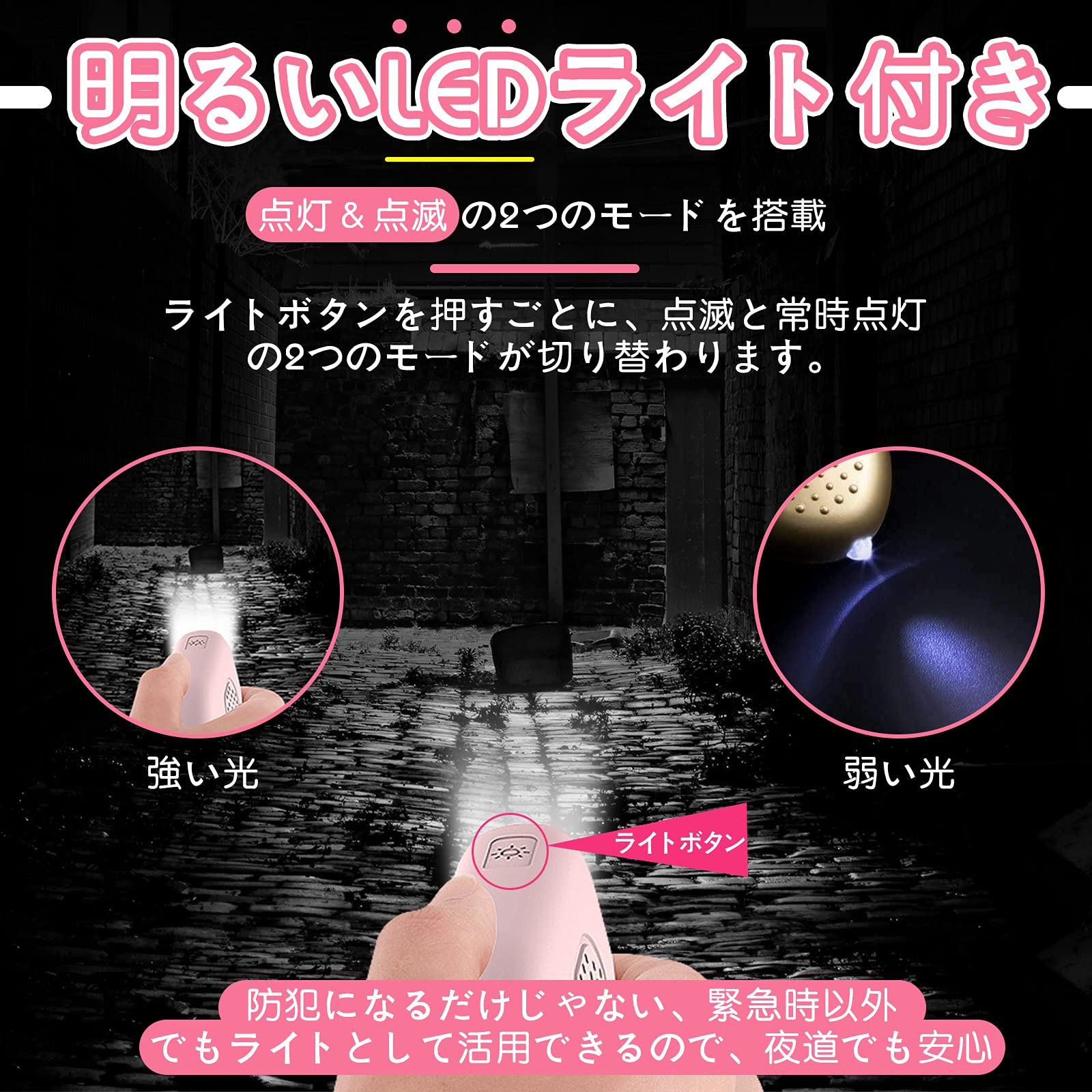 【夜道で使える明るいLEDライト付き】防犯ブザー本体下部にワイドなLEDライトがつき、 懐中電灯のように使える、音と光のダブルで危険を知らせることができます。また暗い場所で作業するときや、家の鍵を取り出すときも便利です。 ライトは点灯モードと点滅モードの2パターン。