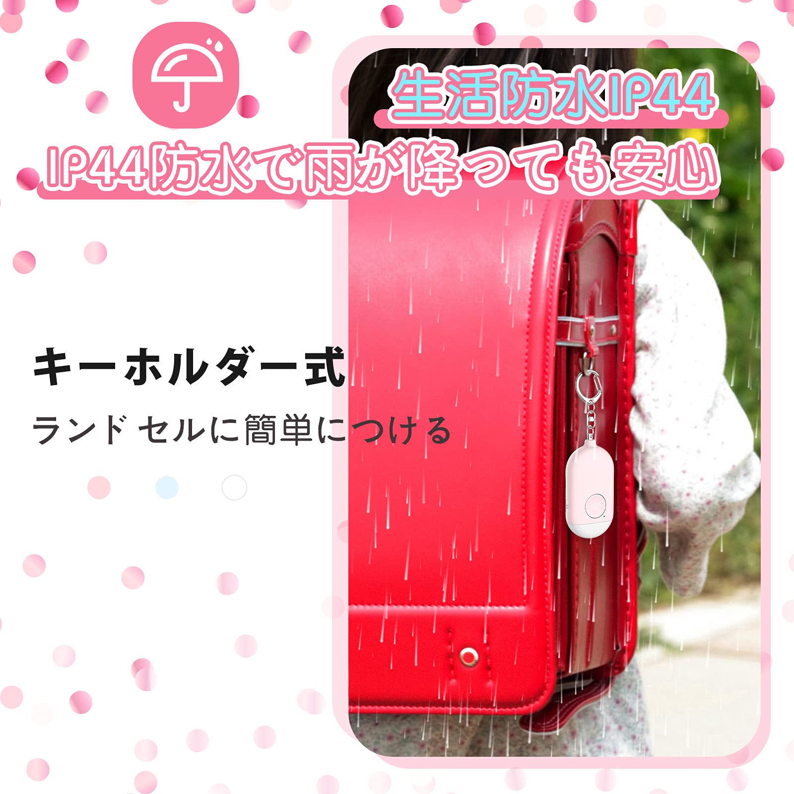 【雨の日でも安心のIP44生活防水】IP44防水機能つき、雨の日に傘から落ちてくる雫などでブザーが濡れても、壊れるリスクを減らせます。シンプルでおしゃれなデザイン、お子様はもちろん、大人がもっていても違和感がありません。