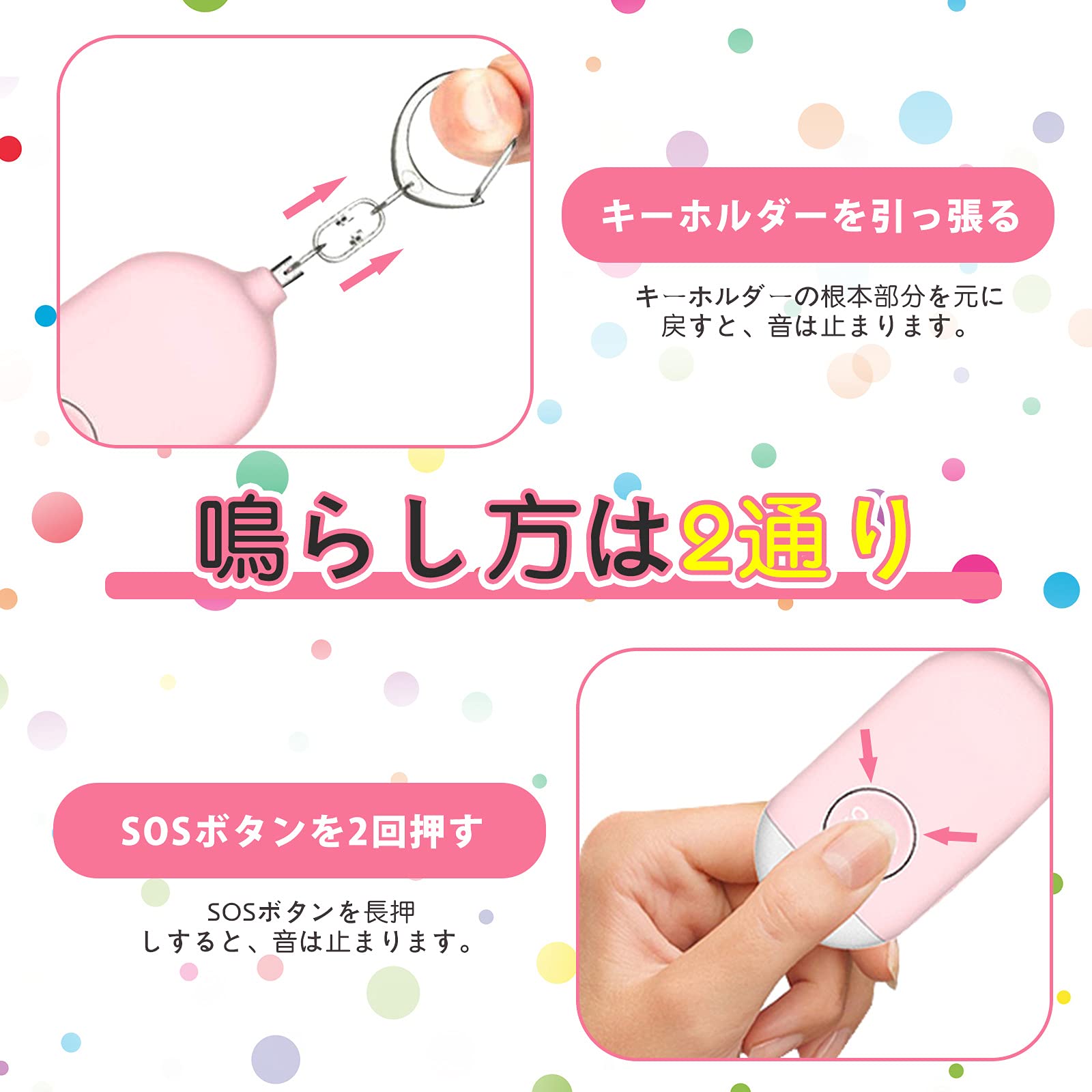 【簡単に操作できる二つの使い方】ブザーの鳴らし方(1):ピンを抜くと大音量のブザーが鳴ります。消したい時はピンを元に戻して下さい。ブザーの鳴らし方(2):SOSボタンを2回押すとブザーが鳴ります。消したい時はSOSボタンを長押しして下さい。