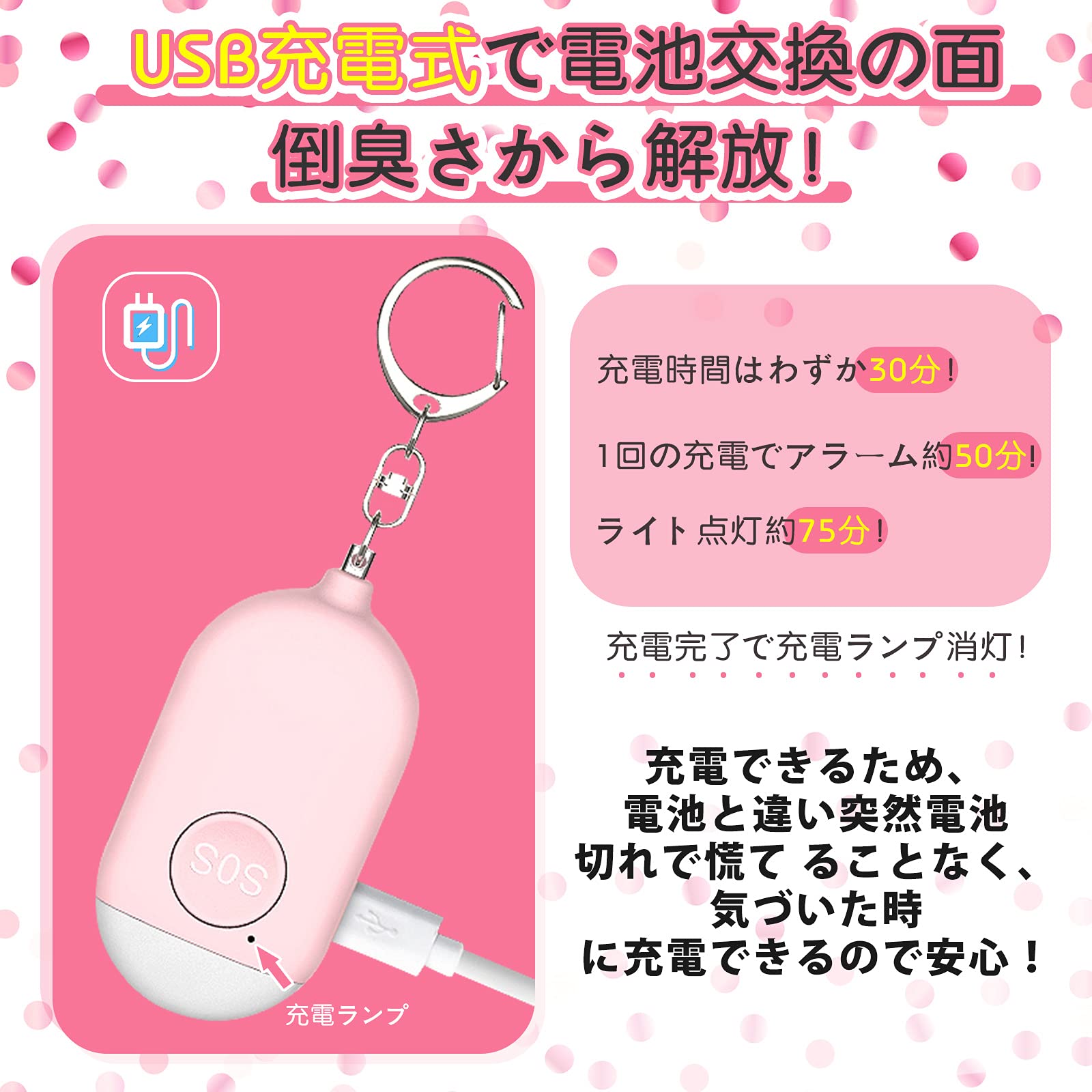 【面倒な電池交換が不要のUSB充電式】繰り返し使えるUSB充電式防犯ブザーで、エコで経済的だけではなく、面倒な電池交換がなくなり、いざという時に電池切れで鳴らない!なんてことはないので安心。充電時間わずか30分!フル充電で50分間鳴らり続ける!