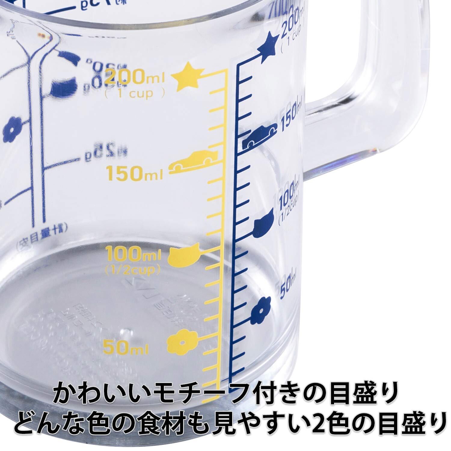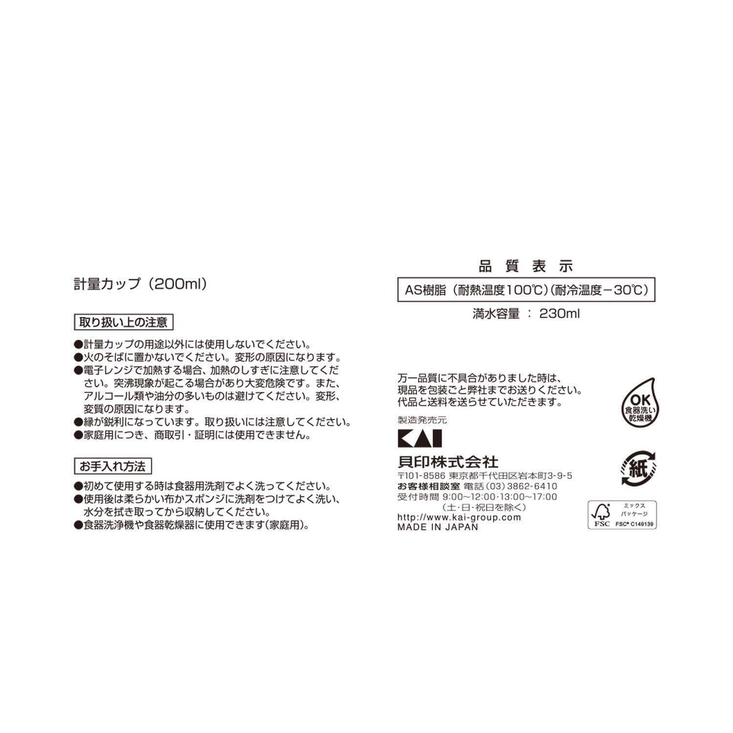 貝印 KAI 計量カップ 200ml リトルシェフクラブ 日本製 DL7207 サイズ:6.5×9.5×9.5cm 重量:57g 素材・材質:AS樹脂(耐熱温度:100℃、耐冷温度:-30℃) 生産国:日本 しっかり握れる大きめハンドルの計量カップ こどもにも分かりやすいよう目盛りごとにモチーフ付きで親も指示がしやすい
