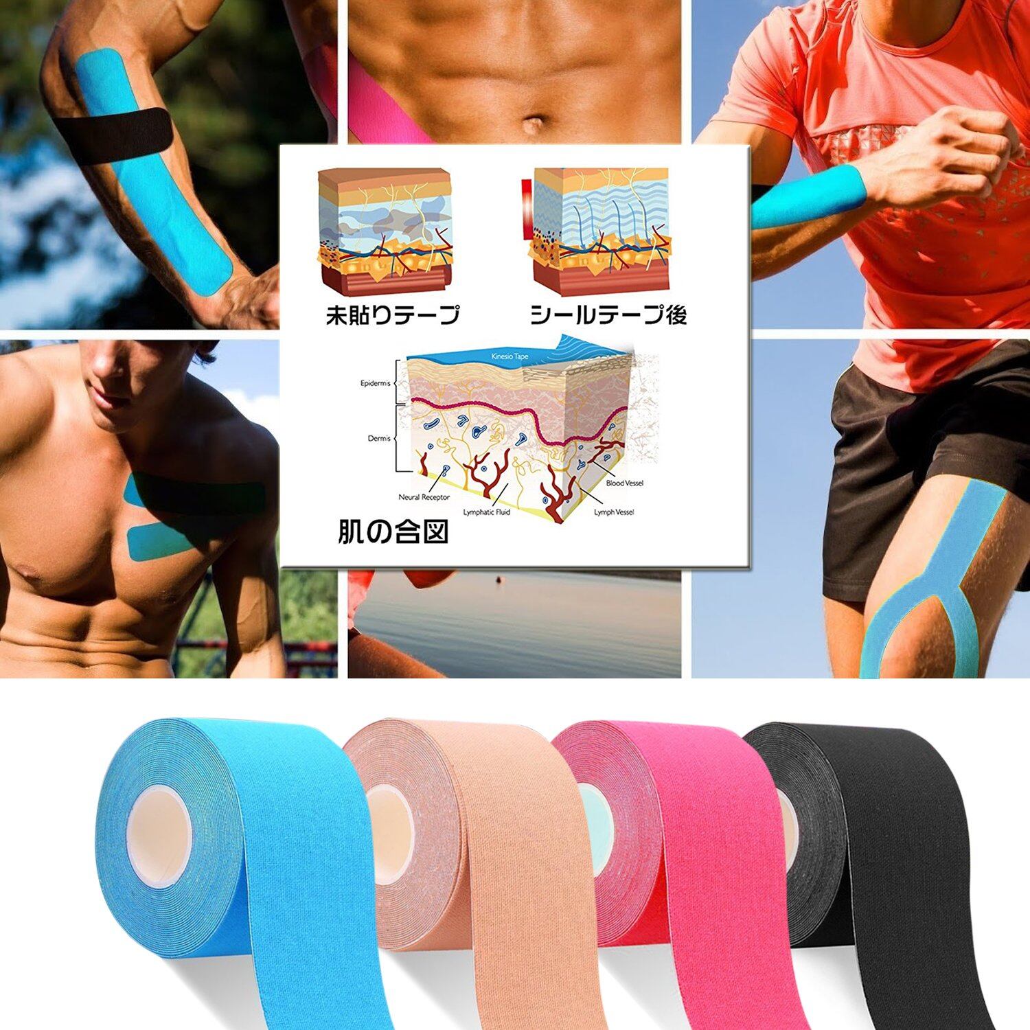 粘着力が1.5倍にして、特に剥がれにくく耐久性、耐水性にも優れており、 重ねて張っても、切り口からめくれていません。 水泳、ビーチバレー、ウルトラマラソンなど、あらゆるタフな環境でも剥がれにくい粘着剤を採用。汗や水にも強いので、夏場のトレーニングやシャワーでも剥がれにくい。