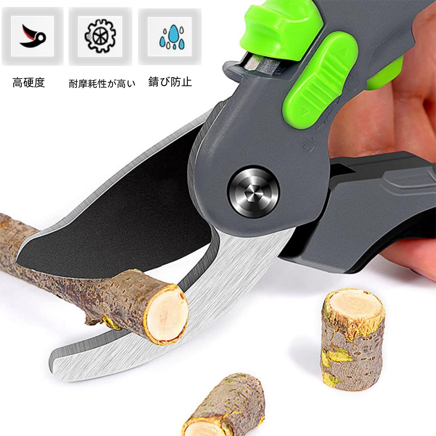 【耐久性・錆びにくい】SK5高炭素テフロン鋼から作られて高硬度で切れ味抜群です。細い枝から太さ25mmまでの枝を簡単に切ることができます、切れ味が良くて切断面が平にキレイ 。剪定ばさみの刃にはフッ素コーティングが施されており、ヤニがつきにくく、錆びにくいのでお手入れが簡単です。