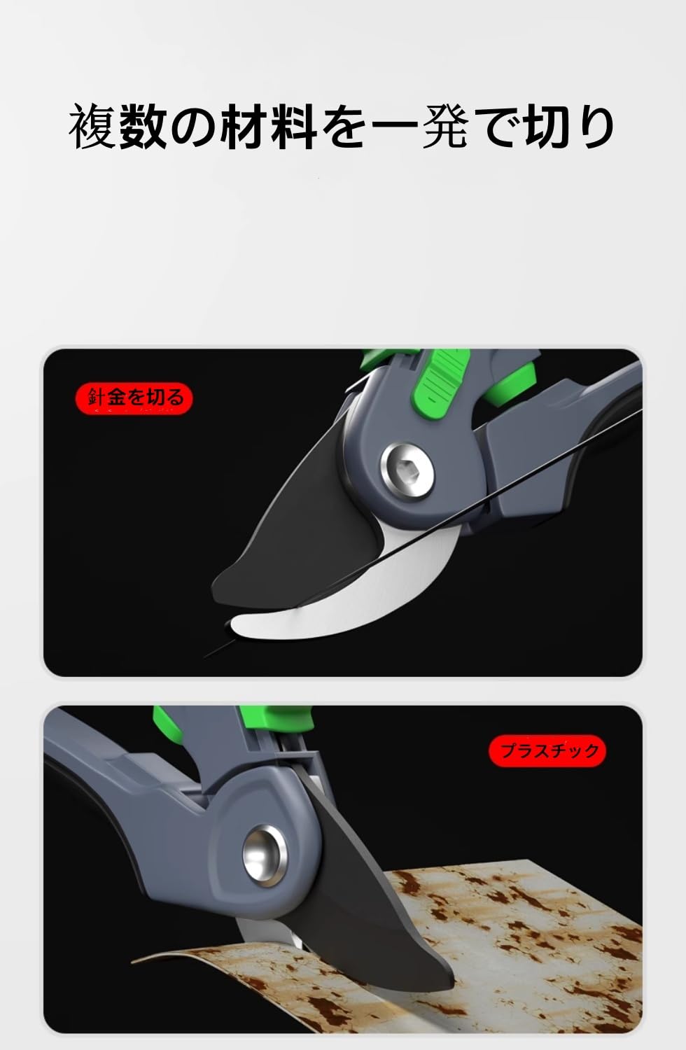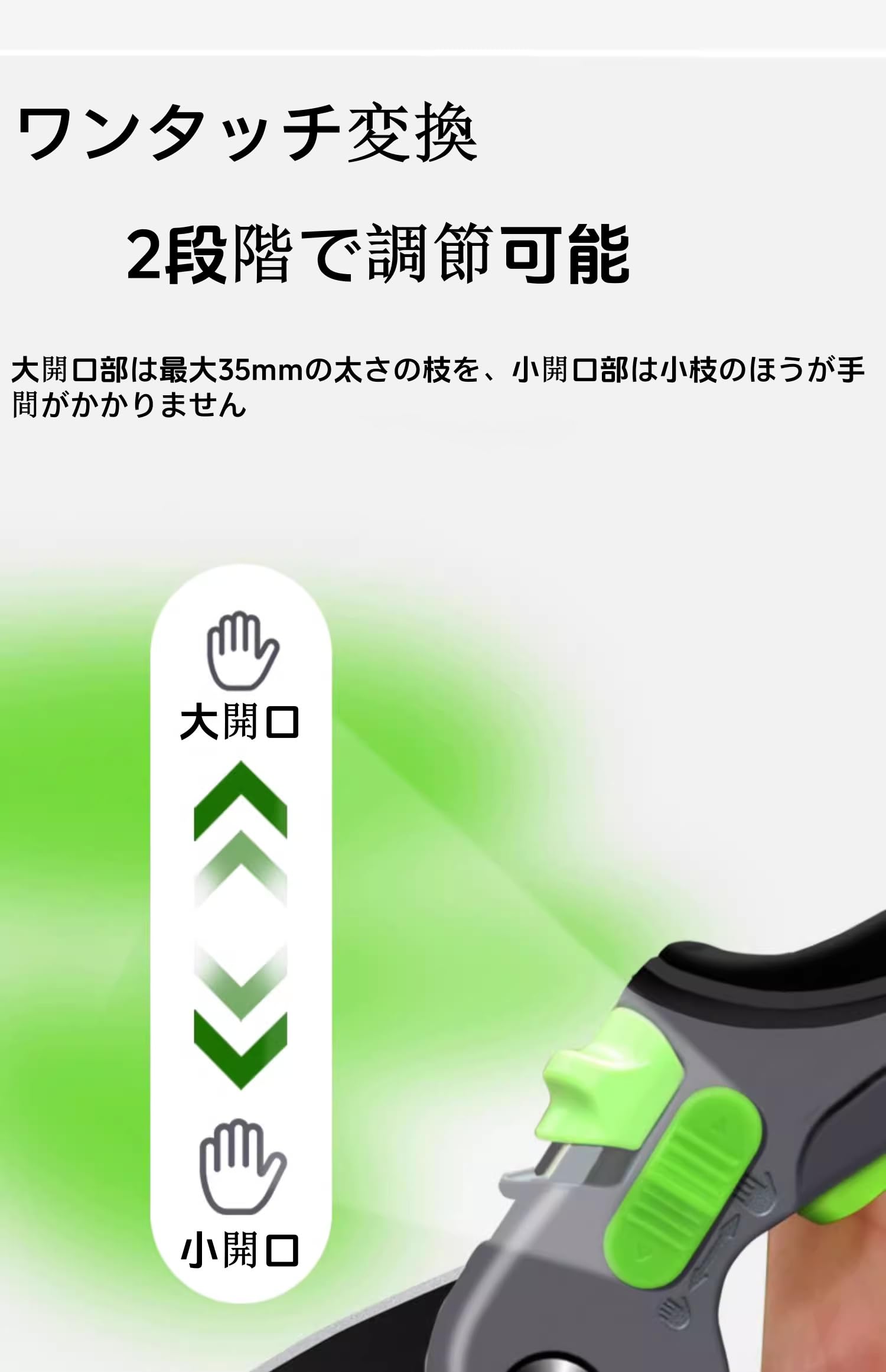 【二段階調節可能】スライド式の2段階調節機能で、細枝(12mm以下)〜太枝(25mm以下)までワンタッチで切り替え可能です。ガーデニング作業の負担を軽減します。