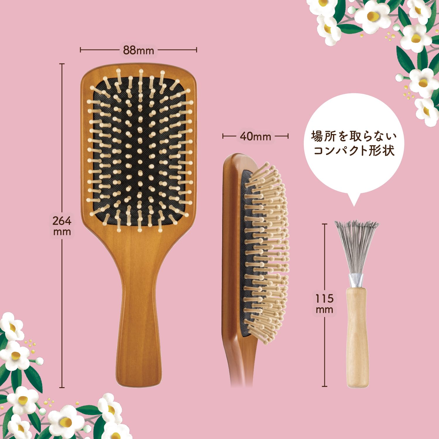 ●ピンには木材(ヒメツバキ)を使用しているため、樹脂製のブラシよりも静電気が発生しにくい。
