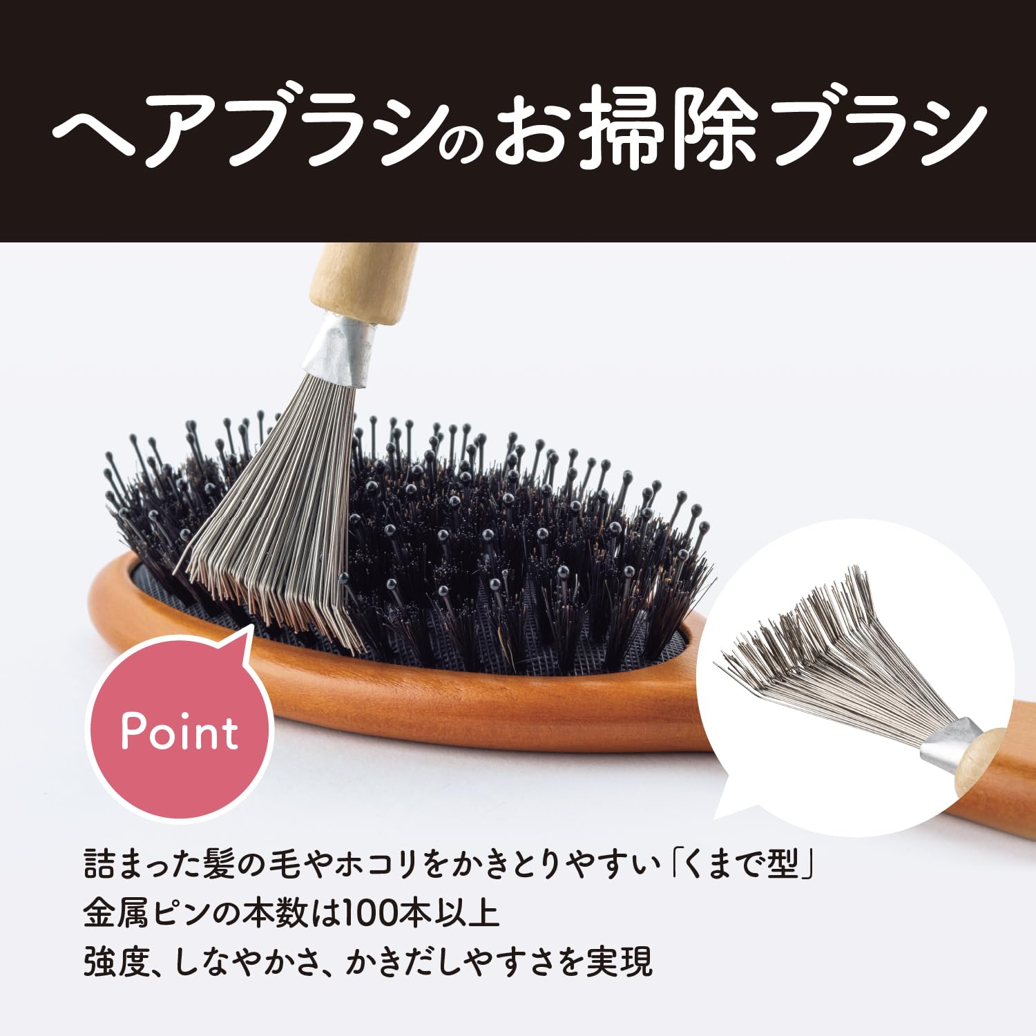 【金属ピン100本以上を使用したくまで型】金属製のブラシをくまで型に植え込むことで、細い毛のブラシに絡まった髪の毛やホコリを簡単にかきとることができます。