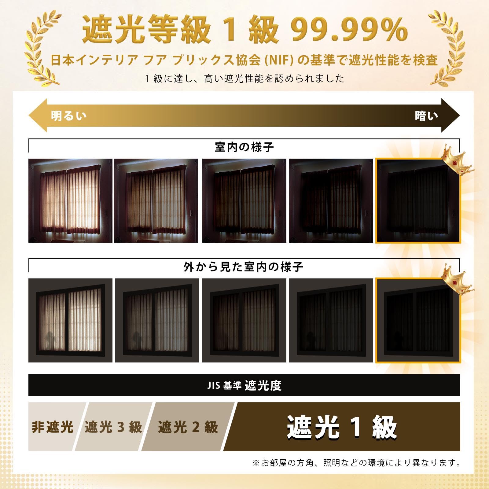 1級遮光:250gsmポリエステル生地(三層構造)で仕上げた一級遮光カーテン、遮光率は99.99%以上、外からの光をほとんど通さなく、昼間でもぐっすり眠れます。ホームシアターを楽しんでいただき、室内の光が外に漏れることを防止し、外から部屋中の様子が見えなく、プライバシーをしっかりと守ります。一人暮らしの女性により安心感を与えます。(カーテンの遮光効果は色により若干差があるのでご理解の上、ご了承お願い致します。よりいい遮光効果を追求する方は、濃い色のカーテンをお勧め致します。)