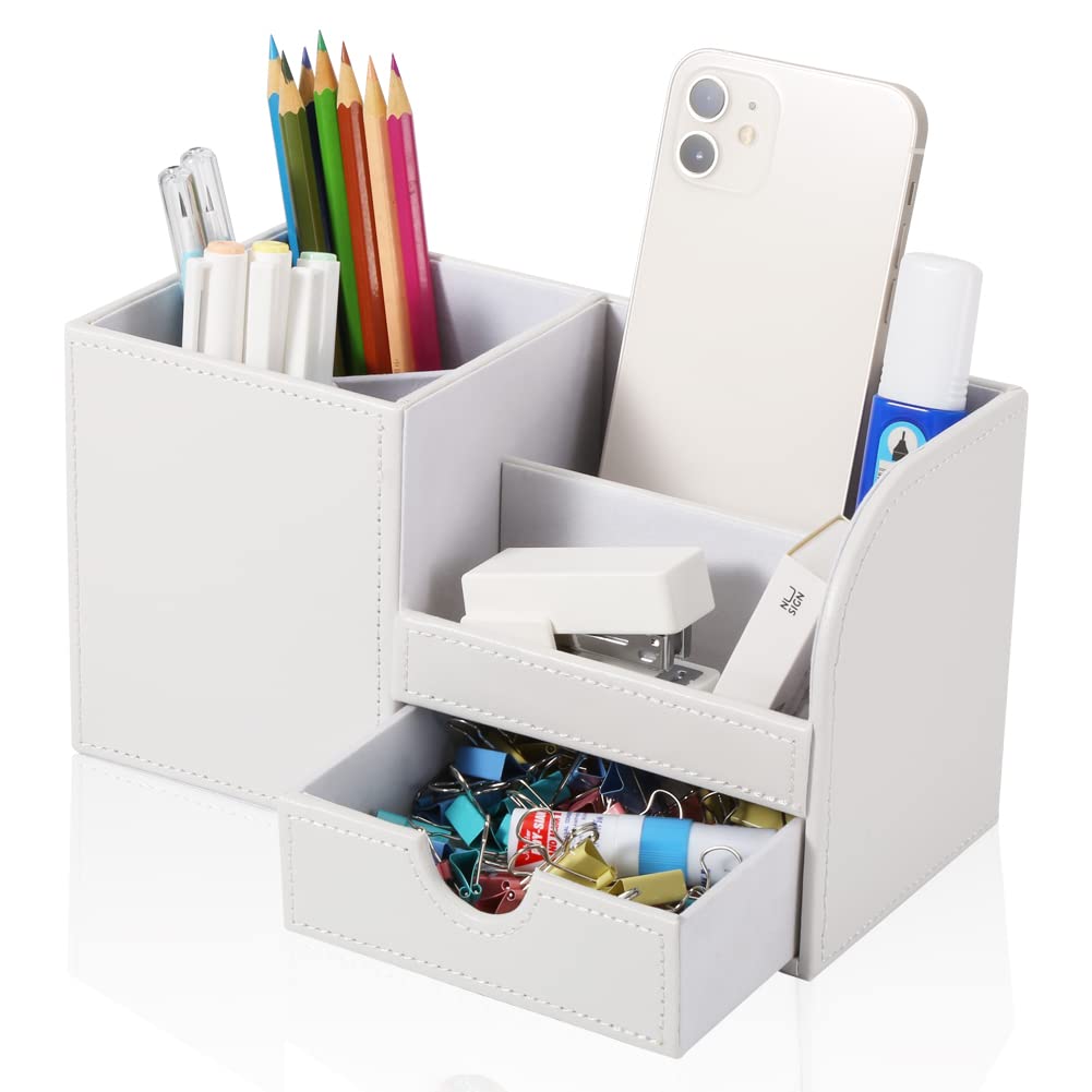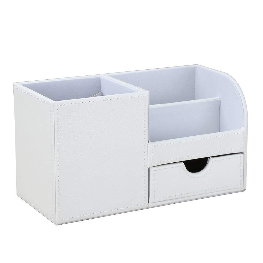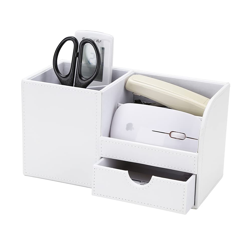 KINGFOM PUレザーデスクステーショナリーオーガナイザー収納ボックスペン/鉛筆スタンドリモートコントロールホルダー小型引き出し付き(ホワイト)