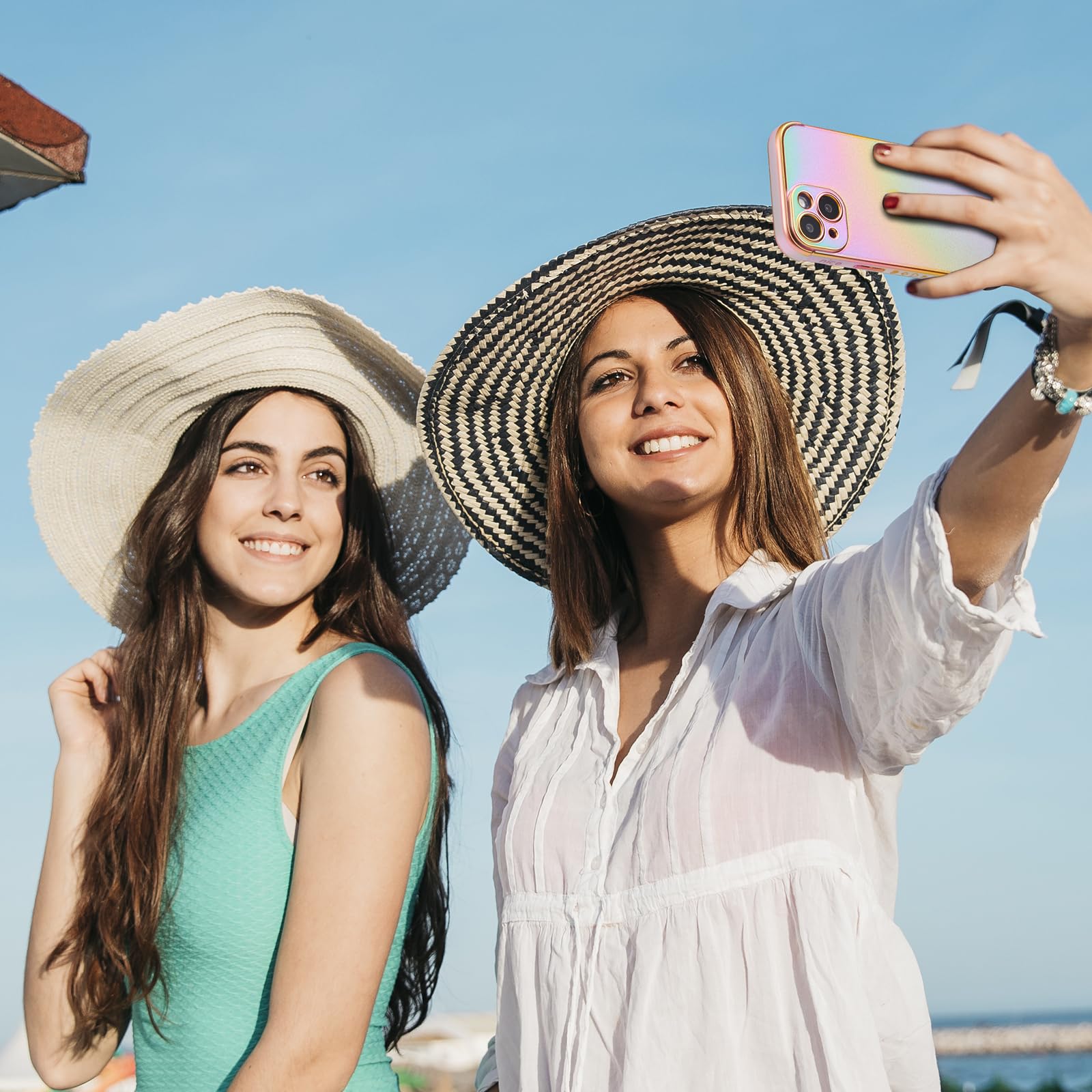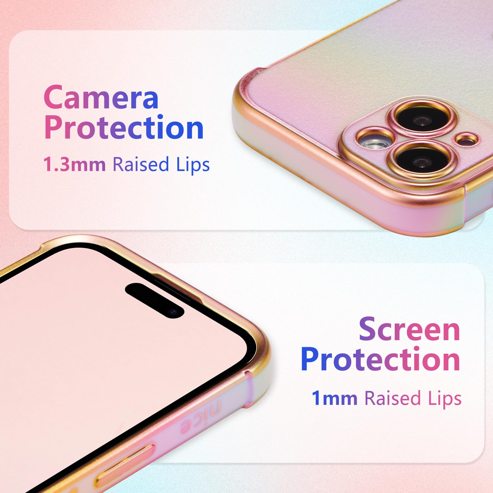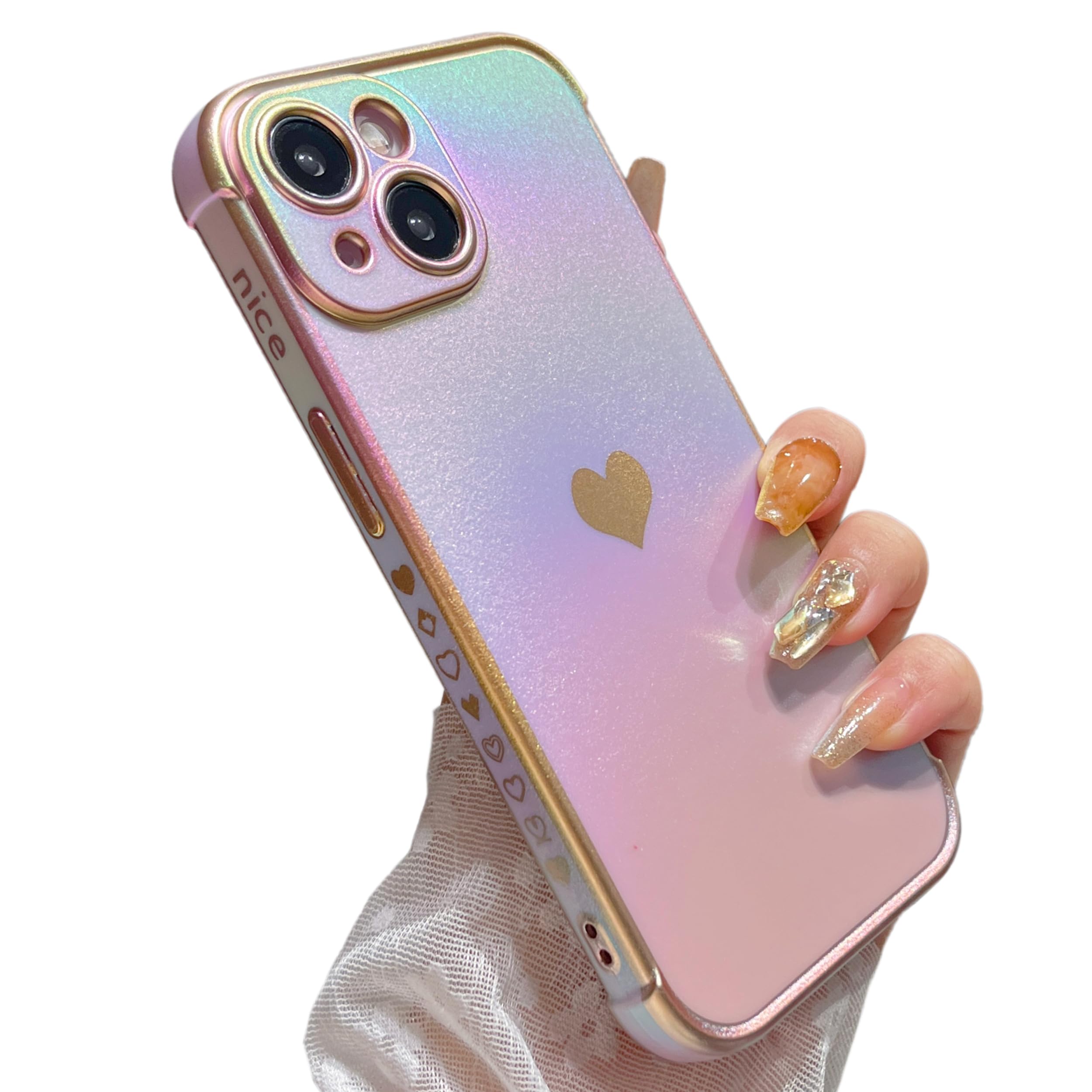 【虹色デザイン】電気メッキ技術により、縁と小さなラブハートパターンを装飾し、メッキされた縁は決して色褪せず、ケース全体が光沢があり、異なる動きや光によって色が変化します; すべてがこのiPhone 15ケースをよりスタイリッシュにし、目を引く;女の子と女性のための素敵な贈り物。