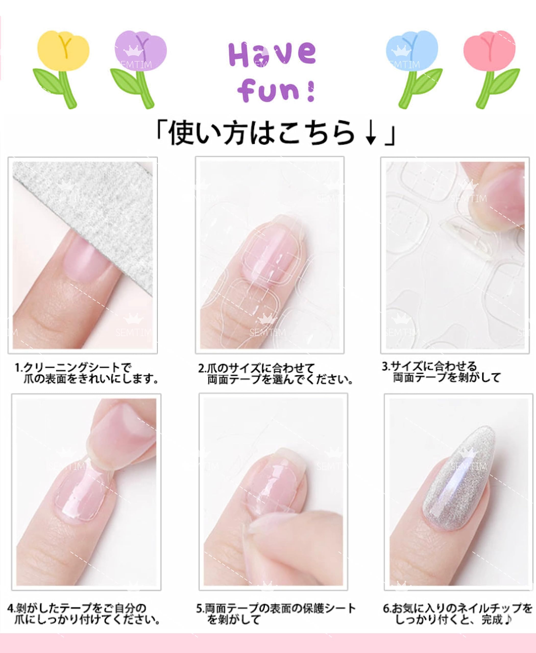【ご使用上の注意事項】油分や水分を拭き取らずに着けた場合、チップが剥がれやすくなります。隙間などがある場合、水などが入りやすく爪が変色する場合がございますのでご注意ください。