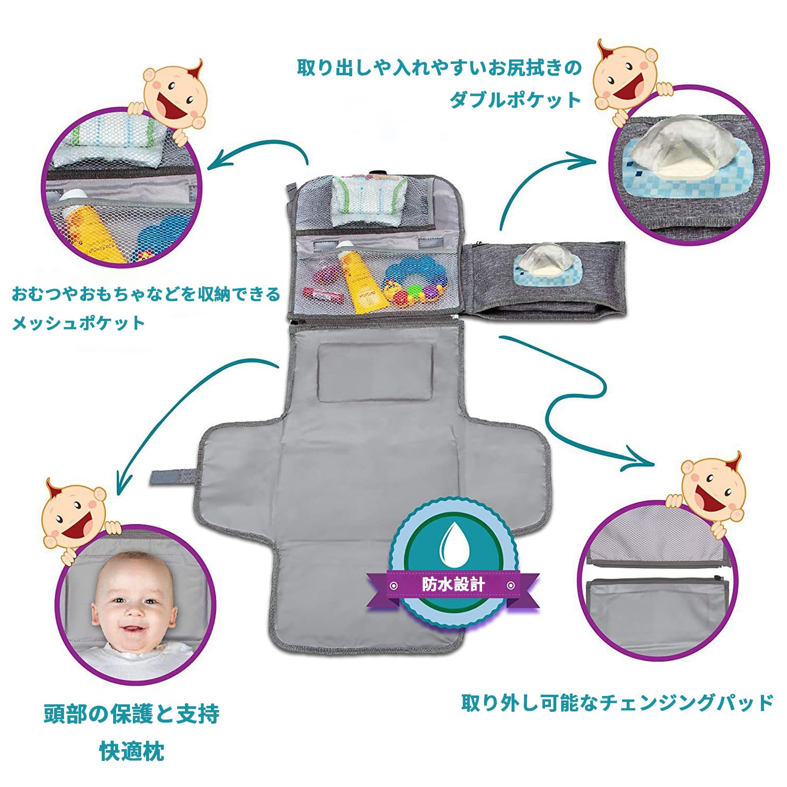 【人気】Wallfire おむつ替えシート ベビー用品 赤ちゃん 防水シート ベビーマット おしめマット 収納 持ち運び 携帯用 外出 折りたたみ 保護枕付き 防水 洗濯可 プレゼント
