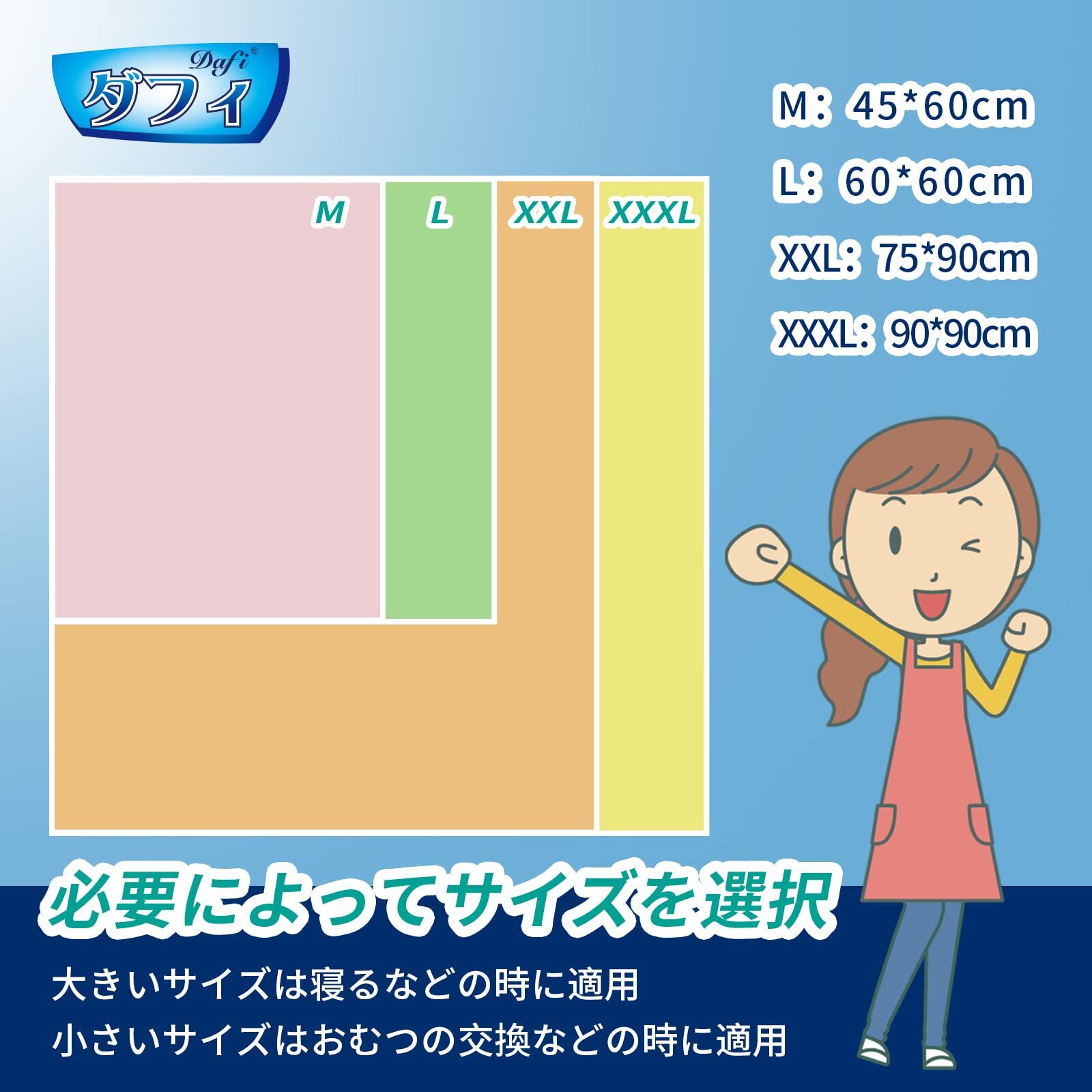 【サイズ選択】の防水シートは四つサイズ選択できます。45*60cmと60*60cmは交換の時お尻の下に収まる。75*90cmと90*90cmは体の下に収まってシートを汚れなくようにします。貴方様の必要によって適合なサイズを選択してください。