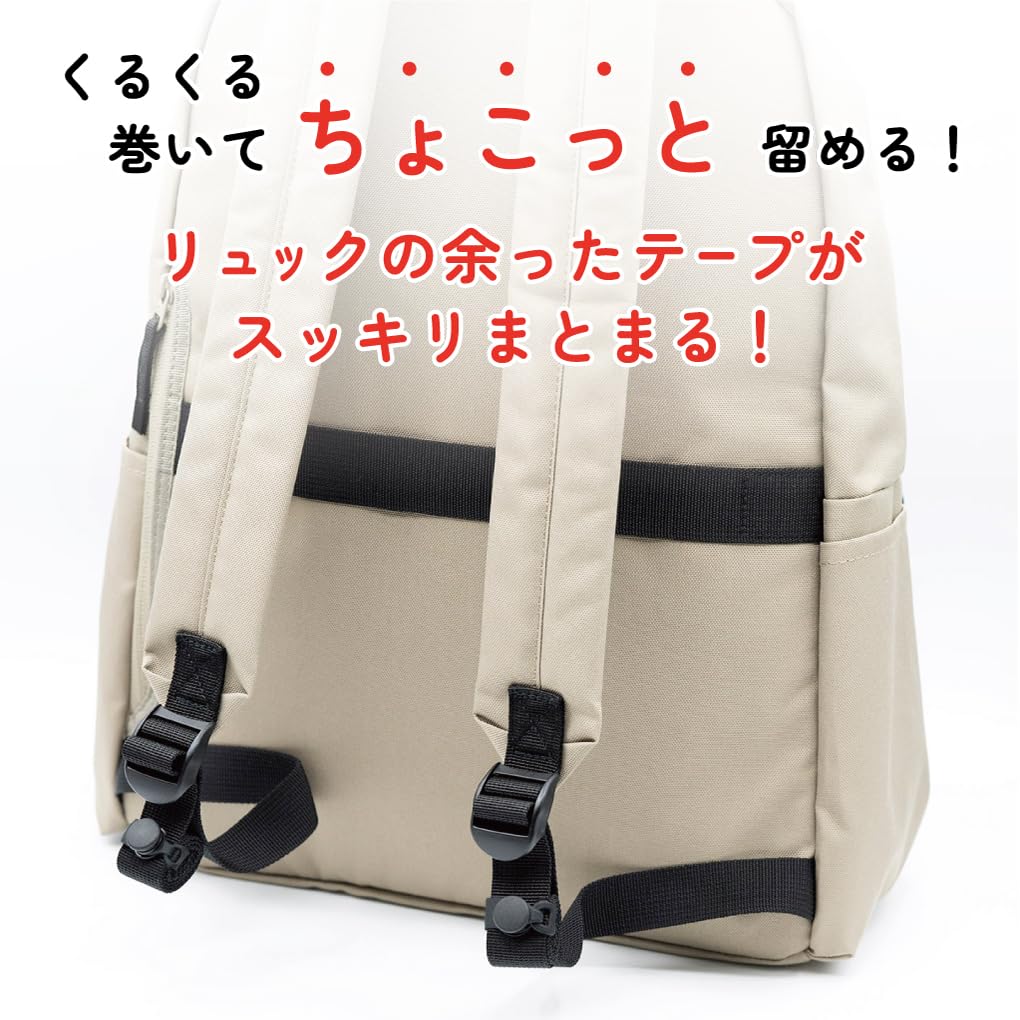 リュックの肩ひものサイズ調整した後のあまったテープをくるくる巻いて、すっきりとまとめて簡単にちょこっととめます。柔らかいシリコーン素材を使っていて伸縮するので、一般的なリュックのテープ幅であればほぼ対応します。巻いたらスナップでしっかり固定。また、シリコーン素材は耐熱性・耐寒性に優れています。※テープ幅25mm対応