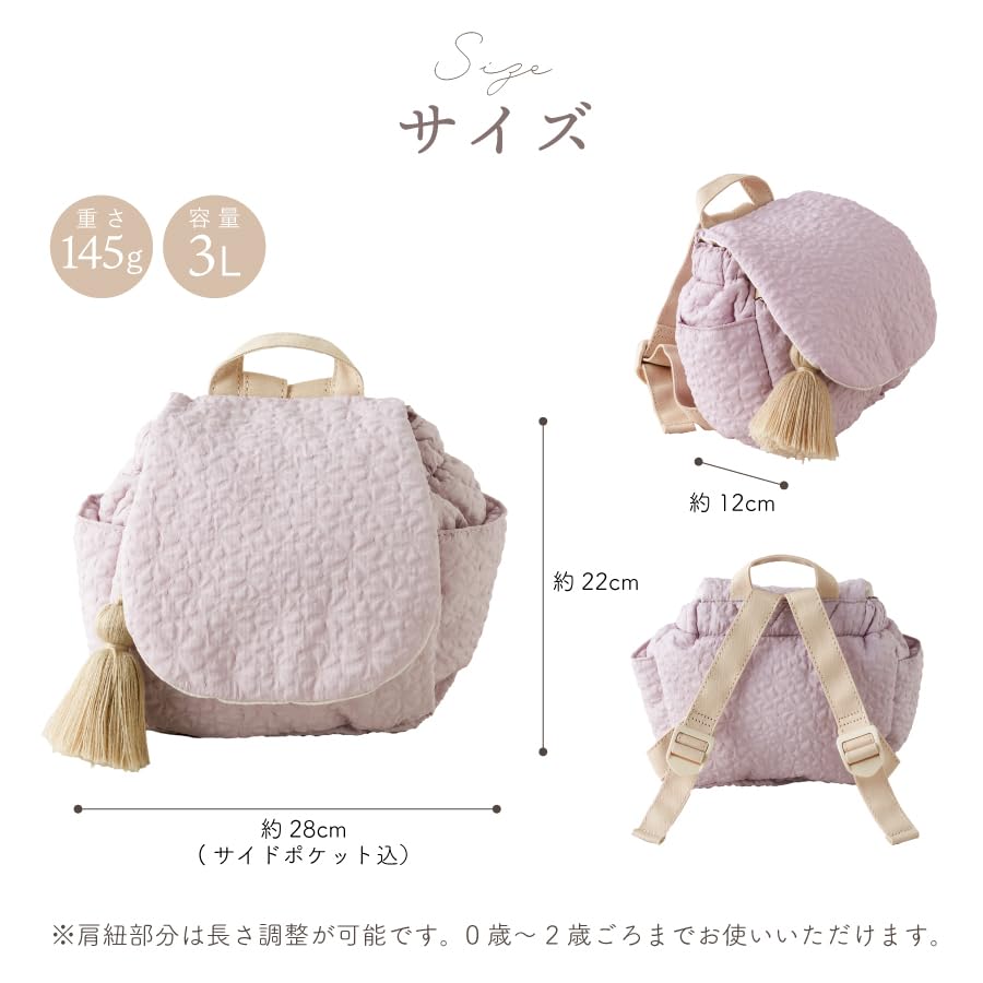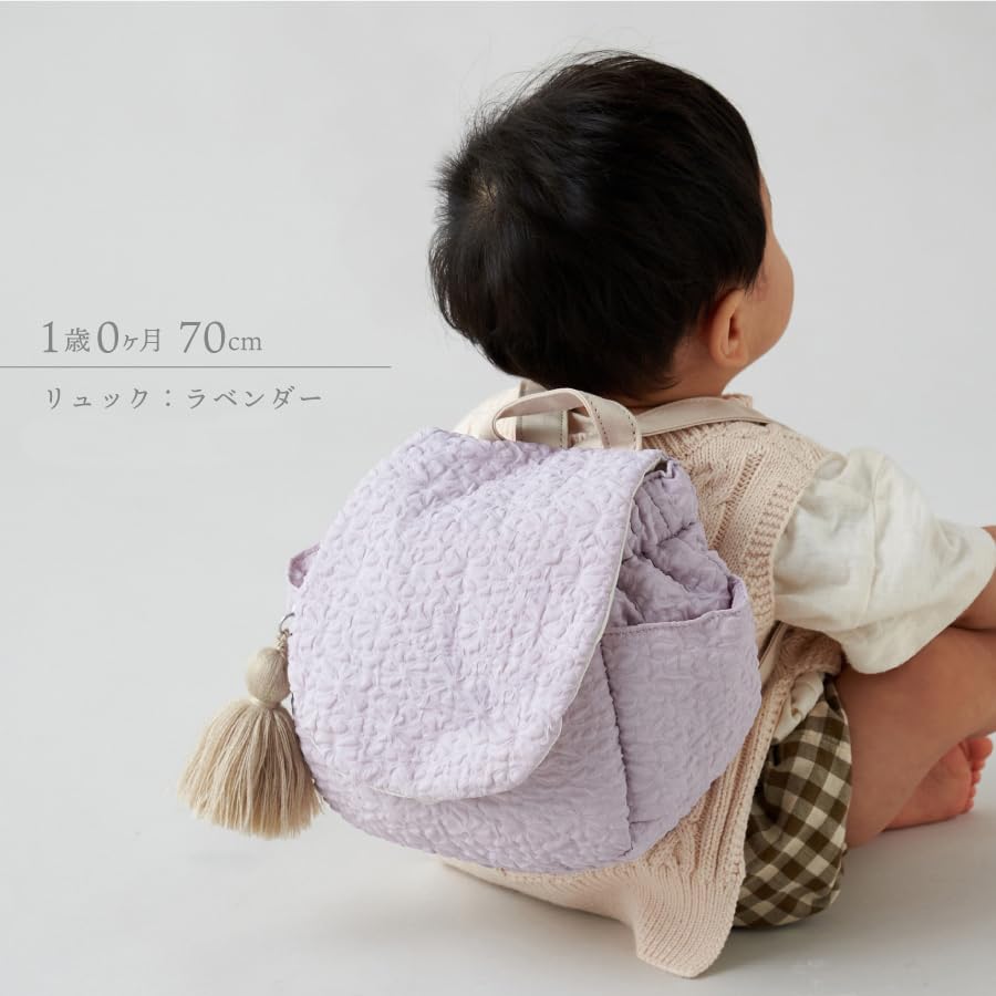 柔らかい素材を使用した「ふわもこベビーリュック」。 「ふわふわ」の素材感と「ころん」としたシルエットで赤ちゃんらしいリュックに仕上げました。 背負った姿は写真に収めたくなる愛らしさです。 小さいお子様でも自分で開けられる柔らかい面テープを使用。 裏地はチェック柄で開けても可愛いデザインです。 付属のタッセルストラップは取り外し可能で、好きなおもちゃに付け替えることも可能です。