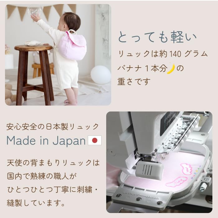 お子様の健やかな成長を願う。 天使の背まもり ベビー リュック。 出産祝い・誕生日プレゼントにはもちろん、一升餅を入れたりなどのご自宅用にも。 「使いやすさはもちろん。赤ちゃんらしさ、かわいらしさも大切に」 丸みを帯びた形、可愛い天使の羽が刺繍されたデザインは、とても上品でリュックを背負った姿はまさに天使。つい遊びに夢中のわが子を抱きしめてしまいます。