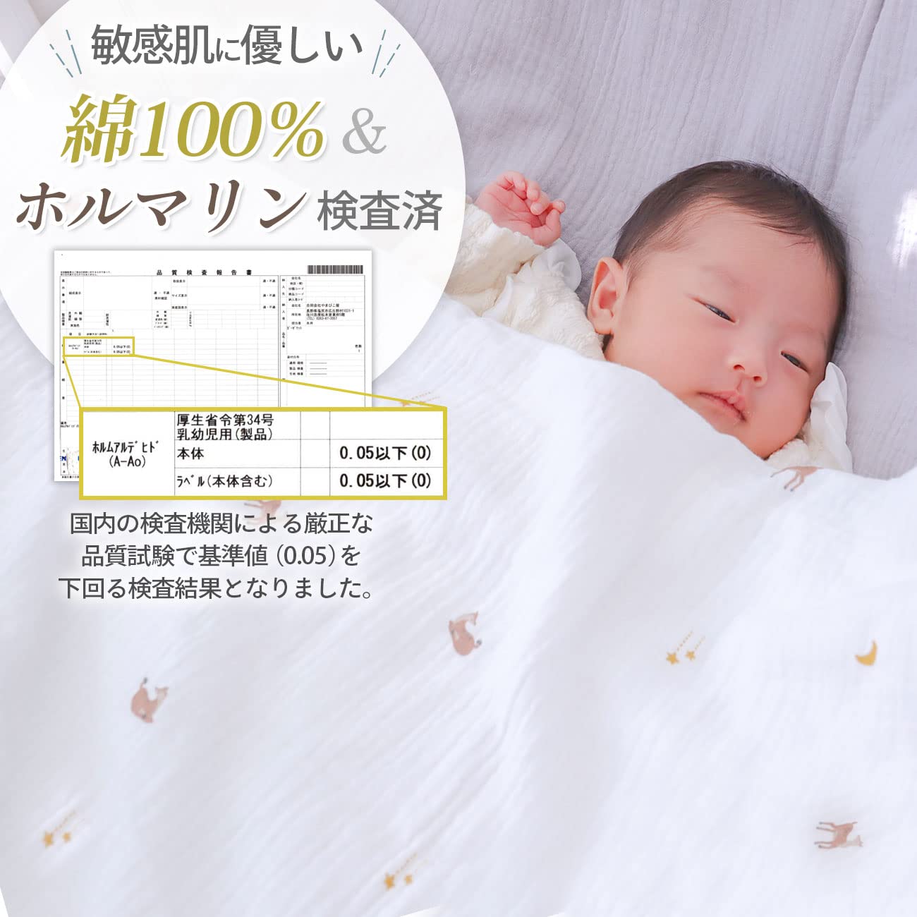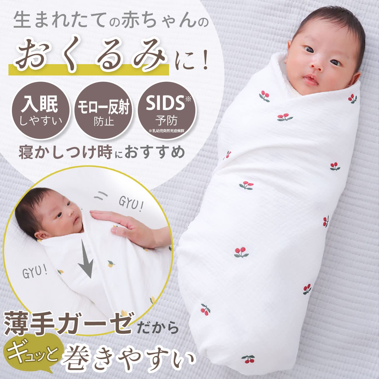【薄手で巻きやすく、おくるみ巻に最適】毎日使うものだから、扱いやすさにこだわった、薄手の2重ガーゼを使用しました。通気性・速乾性にも優れているので、赤ちゃんの汗をたくさん吸っても蒸れにくく、お洗濯をしてもすぐ乾き、清潔にお使いいただけます。 ぎゅっとおくるみで巻くと、ママのお腹の中にいた時と同じ姿勢にしてあげられるので安心してスヤスヤ…。赤ちゃんが泣き止まなかったり、寝つきが悪い時にぜひ試して欲しい巻き方です。