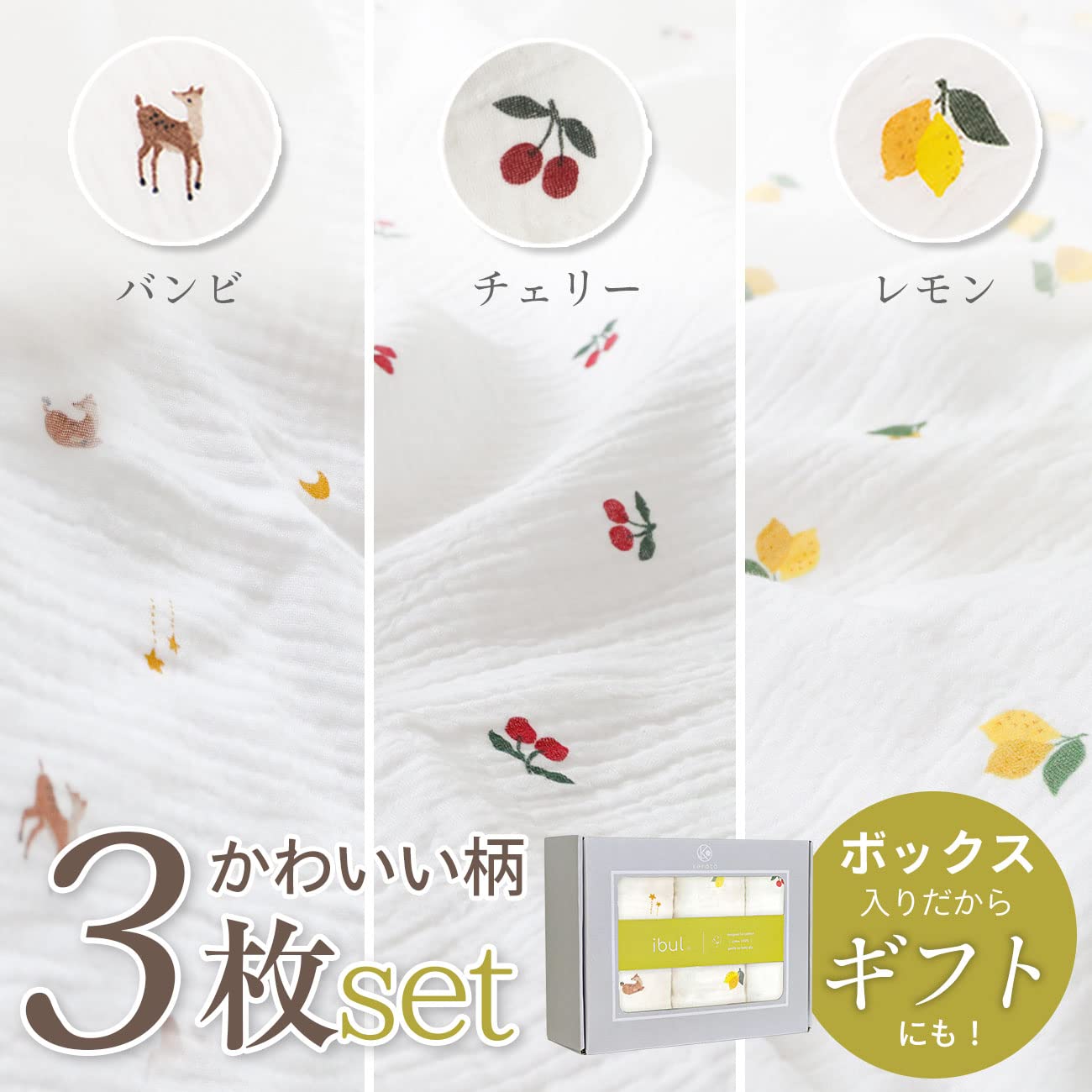 【かわいい3つの柄がセットに】やわらかなイブルガーゼにかわいいプリント柄を散りばめました。ケラッタのイブルシリーズでも人気の3つの柄をセットに!「バンビ」「レモン」「チェリー」各1枚ずつ3枚が入っています。