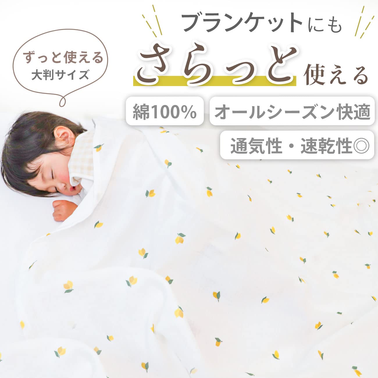 【使い方色々♪正方形サイズ】おくるみだけでなく、ブランケットとしても大活躍。肌寒い日はもちろん、夏のエアコン対策にもぴったりです。大判サイズなので、成長してもずっと使えます♪