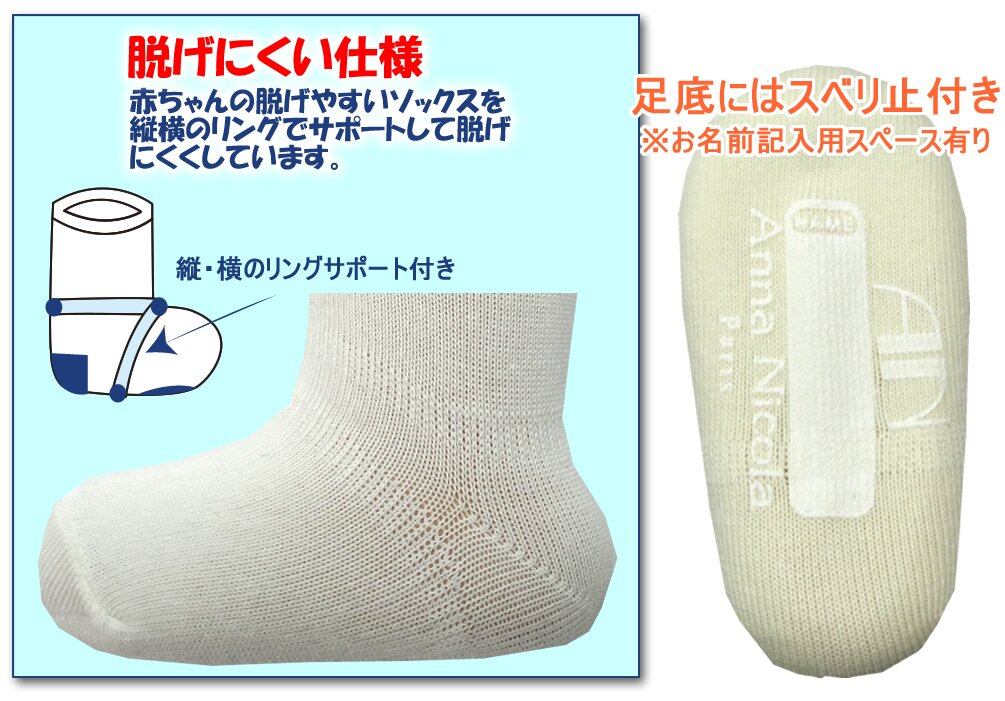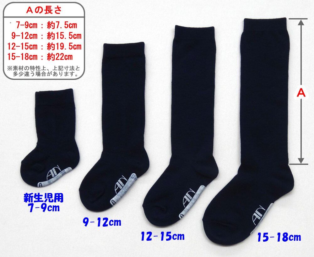 アンナニコラ 長め丈ソックス 12cm - 15cm ネイビー 2113 日本製 [製造国] 日本 日本製のベーシックなカラーのハイソックス。足首に2本のリングサポートを入れているので脱げにくく、足裏の滑り止めにお名前の記入スペースもあるので保育園・幼稚園使いに便利です。